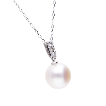 The atonal Akoya pearls have a soft shine that emits a delicate light, harmonizing beautifully with the overall design of the pendant. It brings an elegant glamour to the bosom of the wearer. The platinum (PT900) base is beautifully set with three diamonds, enhancing the graceful brilliance of the pearls.