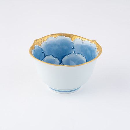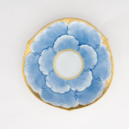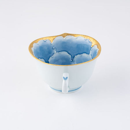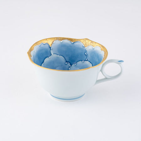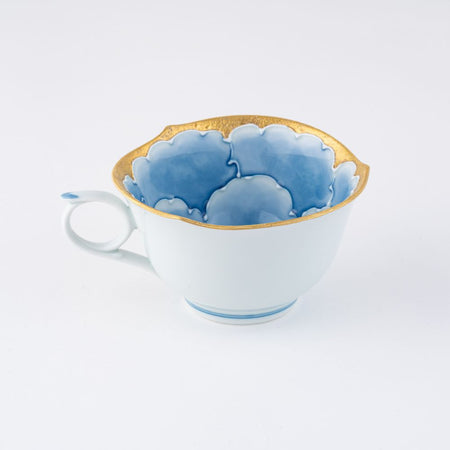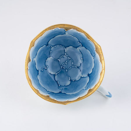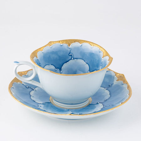Japanese Arita Ceramic Bunzan Kiln Cup and Saucer Blue Gold Flower Design