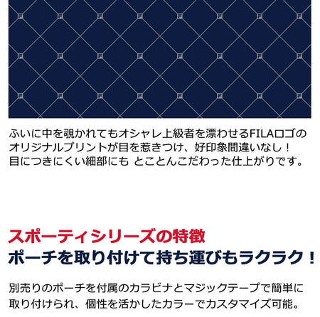 The inside fabric is also stylish! Original fabric with FILA logo. The original print of the FILA logo, which makes you look fashionable even if you suddenly look inside, will catch your eye and make a good impression! It is a finish that sticks to details that are hard to see.