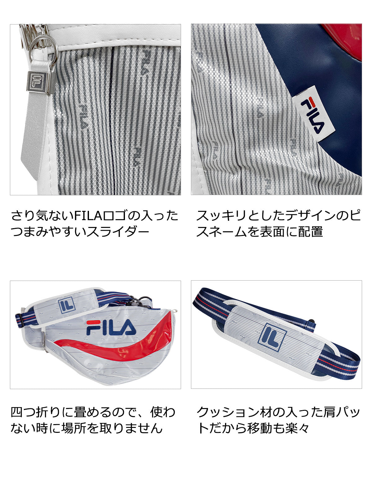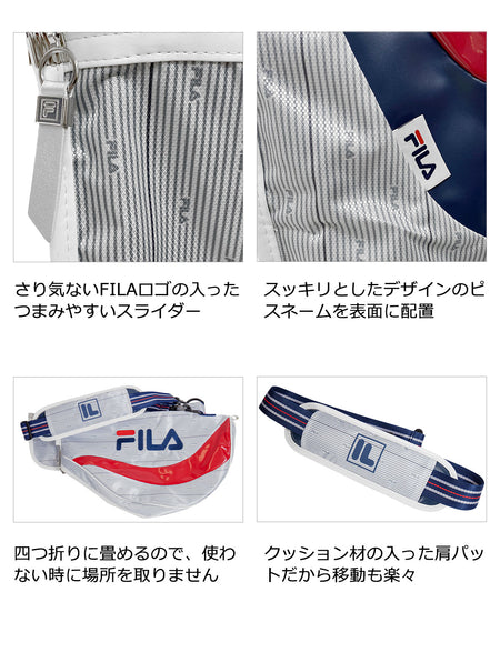 An easy-to-grab slider with a casual FILA logo. Placing a piss name with a clean design on the surface. It can be folded in four, so it does not take up space when not in use. The cushioned shoulder pads make it easy to move around.