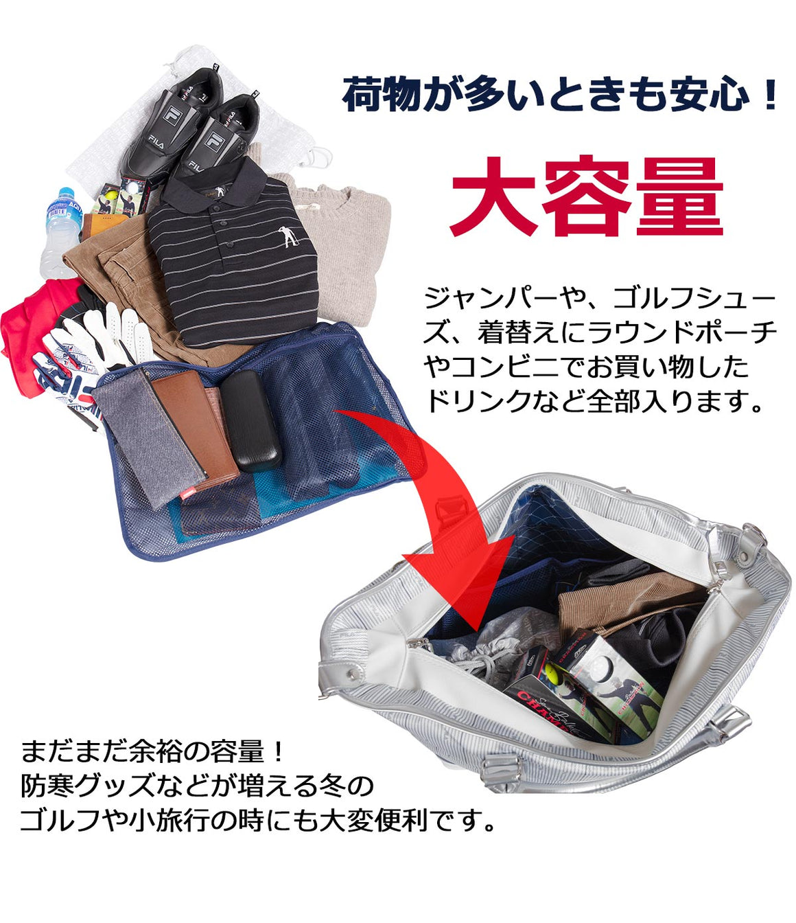 Don't worry if you have a lot of luggage! Large capacity! Jumpers, golf shoes, a round pouch for changing clothes, drinks purchased at convenience stores, etc. are all included.