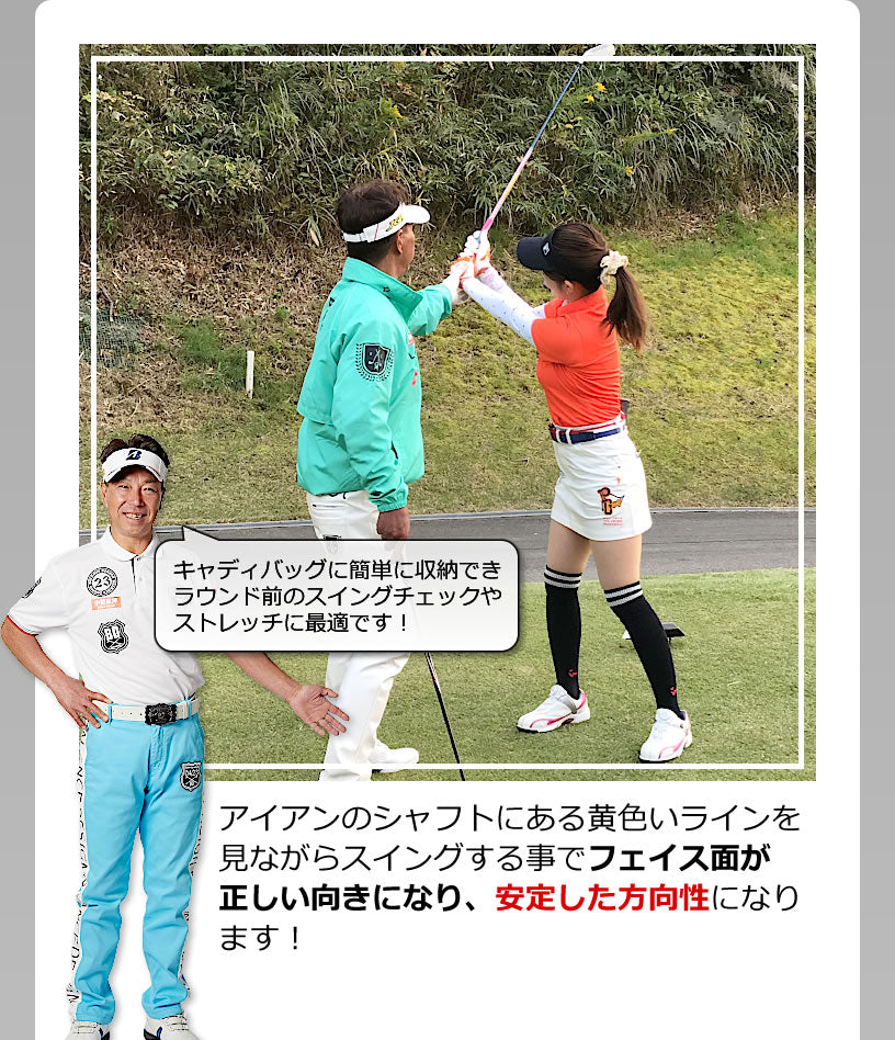 It can be easily stored in a caddy bag and is perfect for swing checks and stretching before rounds! By swinging while looking at the yellow line on the iron shaft, the face surface will be in the correct direction and the direction will be stable!