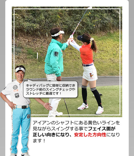 It can be easily stored in a caddy bag and is perfect for swing checks and stretching before rounds! By swinging while looking at the yellow line on the iron shaft, the face surface will be in the correct direction and the direction will be stable!