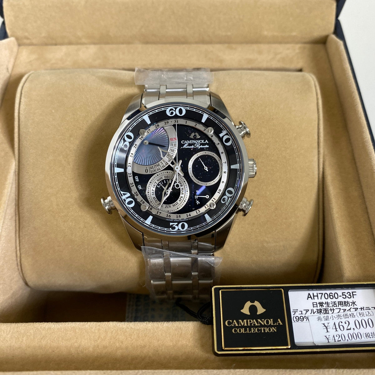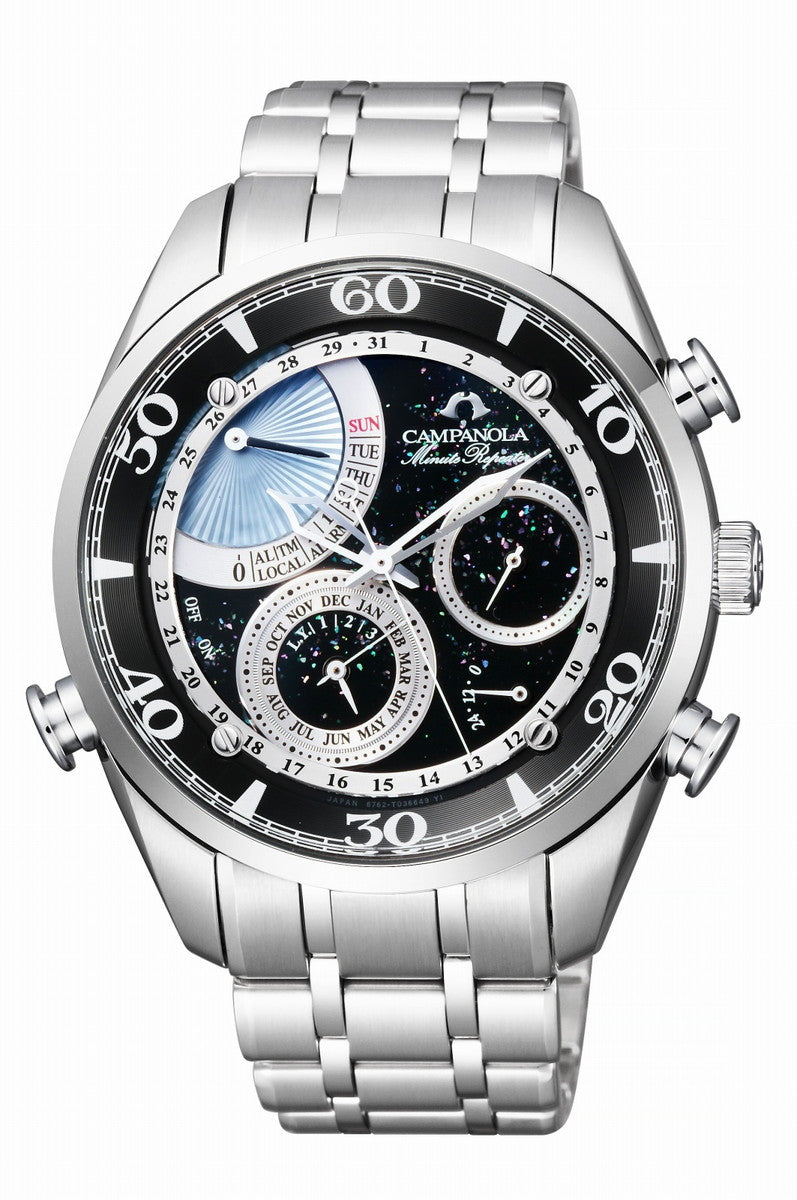 ・Waterproof for everyday life ・Average monthly difference ±20 seconds ・Perpetual Carrender ・Minute repeater ・Alarm 1・2 ・local time ・local time alarm ・24-hour display ・made in Japan