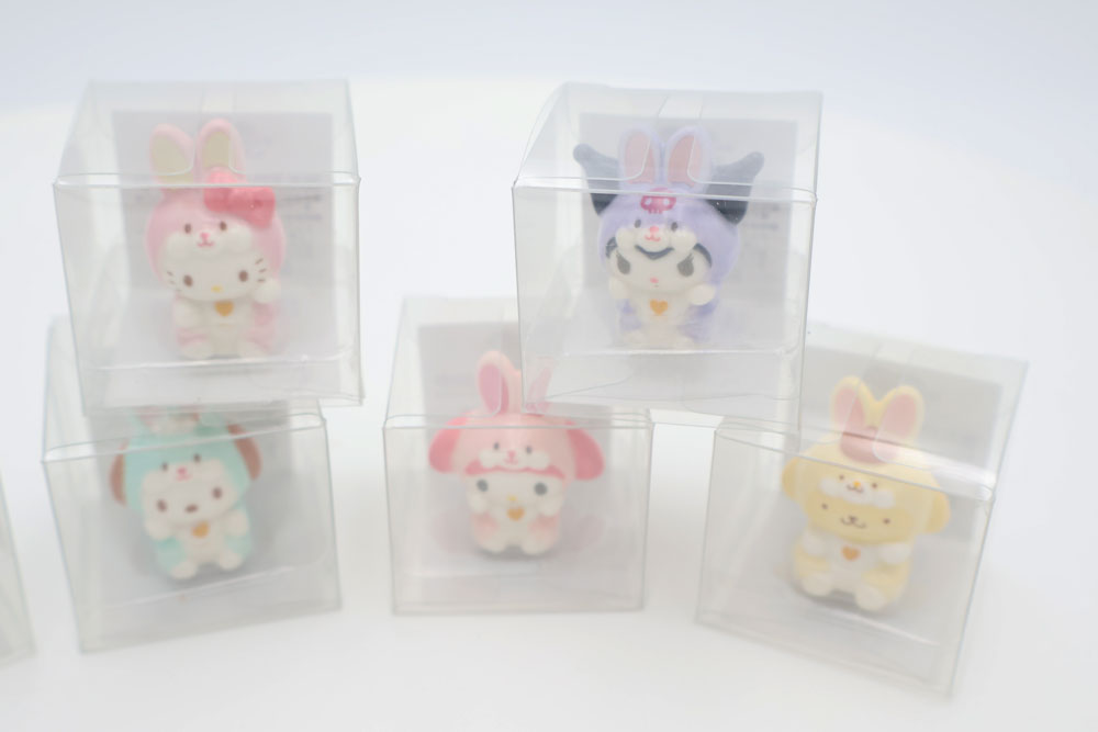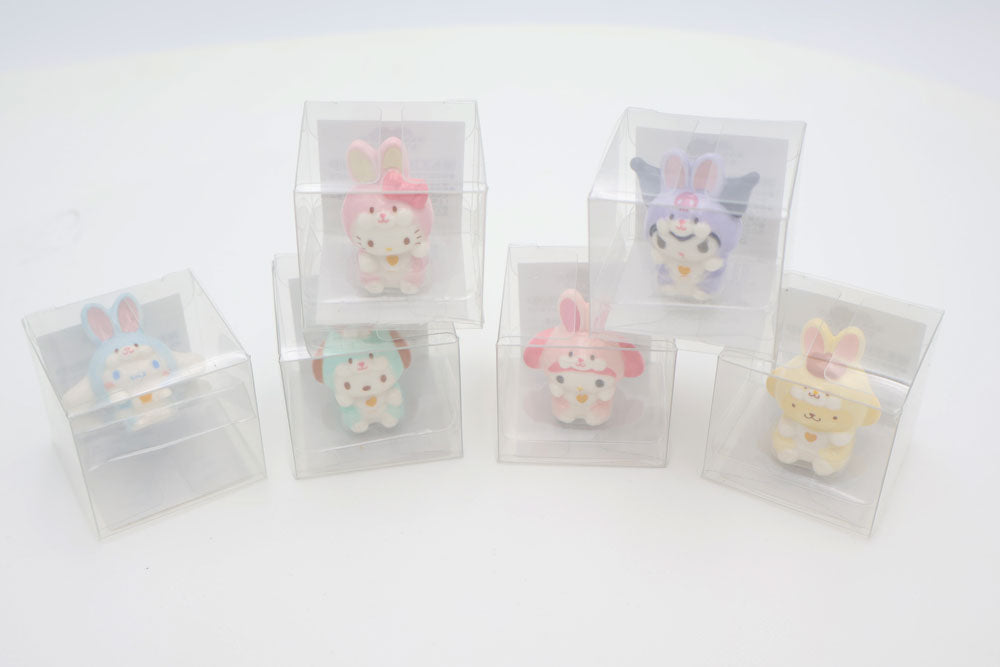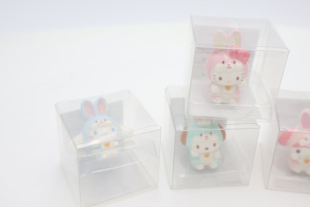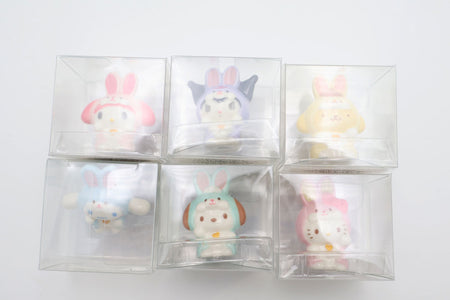 - A set of 6 palm-sized Sanrio mascots wearing cute rabbit costumes.