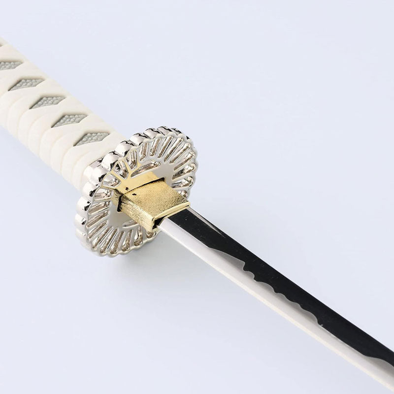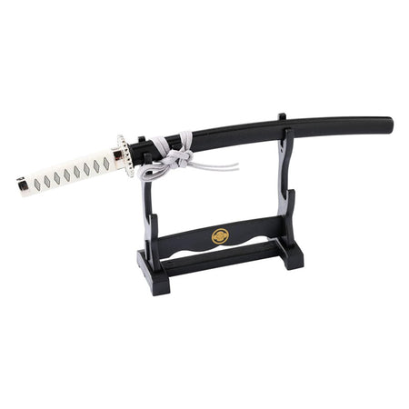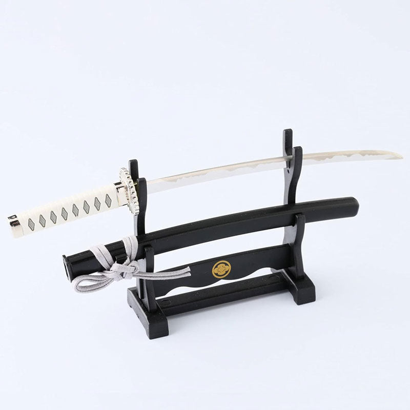 The paper knife is based on Toshizo Hijikata's favorite sword, ``Izumi no kami Kanesada,'' and realistically reproduces the unique blade crest and tsuba. Comes with a horizontal hanging stand with the "Sanbonsugi" family crest.