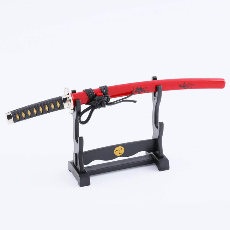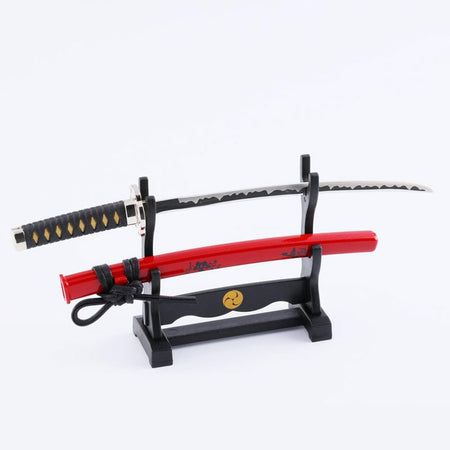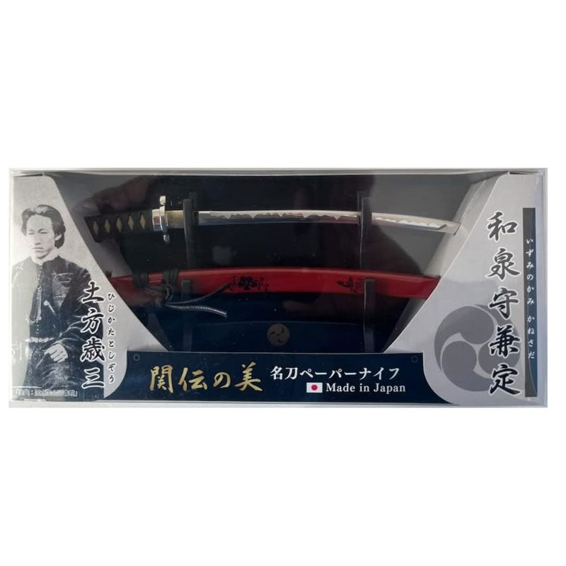 The paper knife is based on Toshizo Hijikata's favorite sword, ``Izumi no kami Kanesada,'' and realistically reproduces the unique blade crest and tsuba. Comes with a horizontal hanging stand with the "Sanbonsugi" family crest.