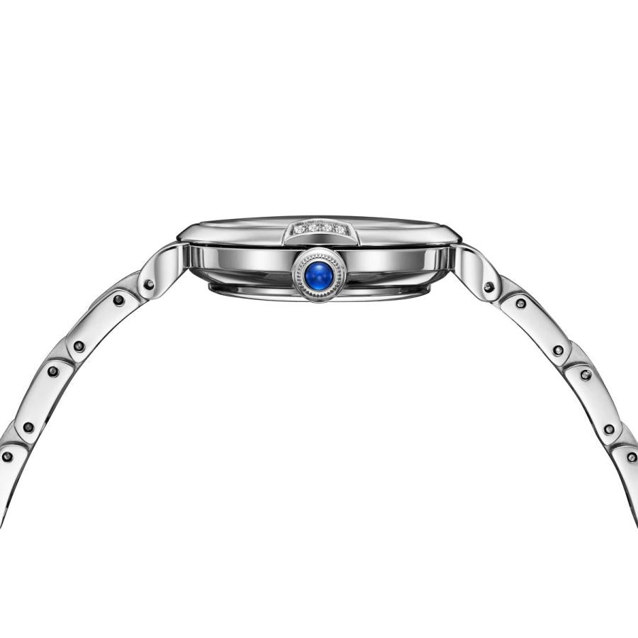 ・The 4-point diamond at the 3 o'clock position, inspired by a perfume bottle, and the blue accents that decorate the crown remind you of the happy feeling of holding a pretty lily of the valley flower in your hand every time you look at your wrist. It is a model that evokes