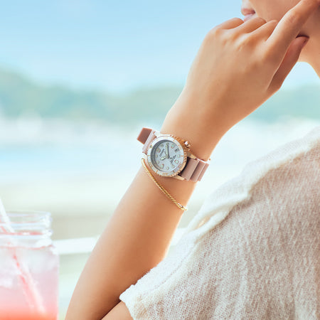 The silver dial, warm gold case and pink band create a gorgeous impression.
