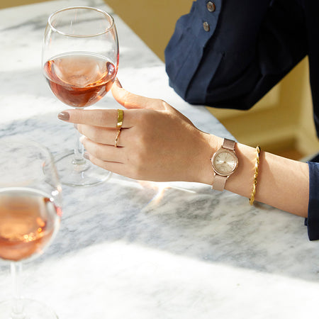 ・The case has a flow line that resembles gently flowing water, and a milgrain ring that looks like a drop on the outer circumference as a motif that watches over the owner's happiness.