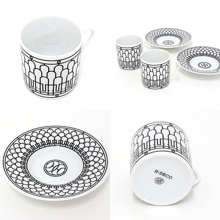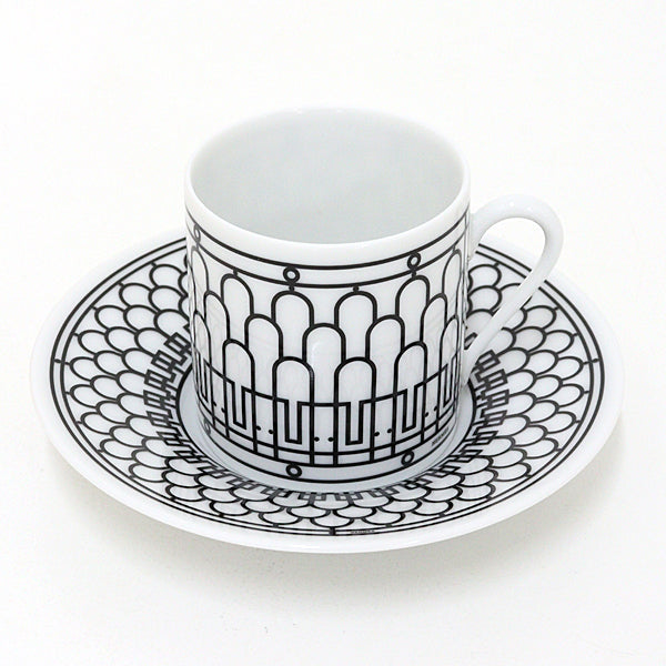 ◆HERMES Coffee Cup and Saucer H Deco Art Deco Silk Screen Print Porcelain.