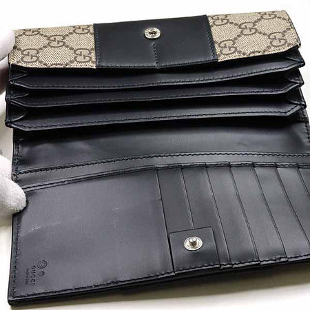 This is Gucci's GG Supreme long wallet. This model combines sophisticated design with functionality. Crafted with high-quality materials and craftsmanship, this wallet is perfect for everyday use or special occasions.