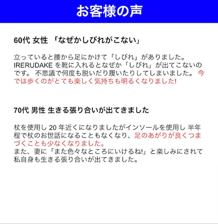 A: By shifting the center of gravity back to the correct position, the IRERUDAKE insole reduces the burden on the foot and relieves pain.