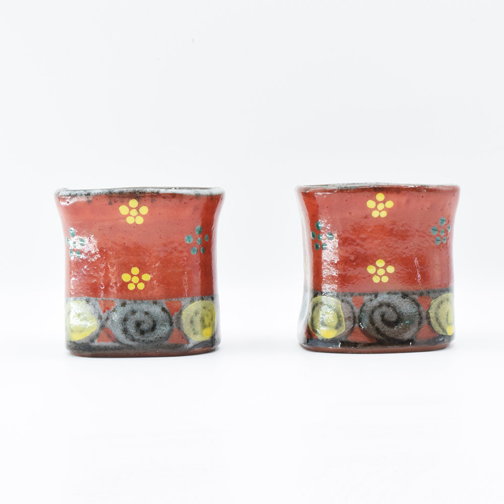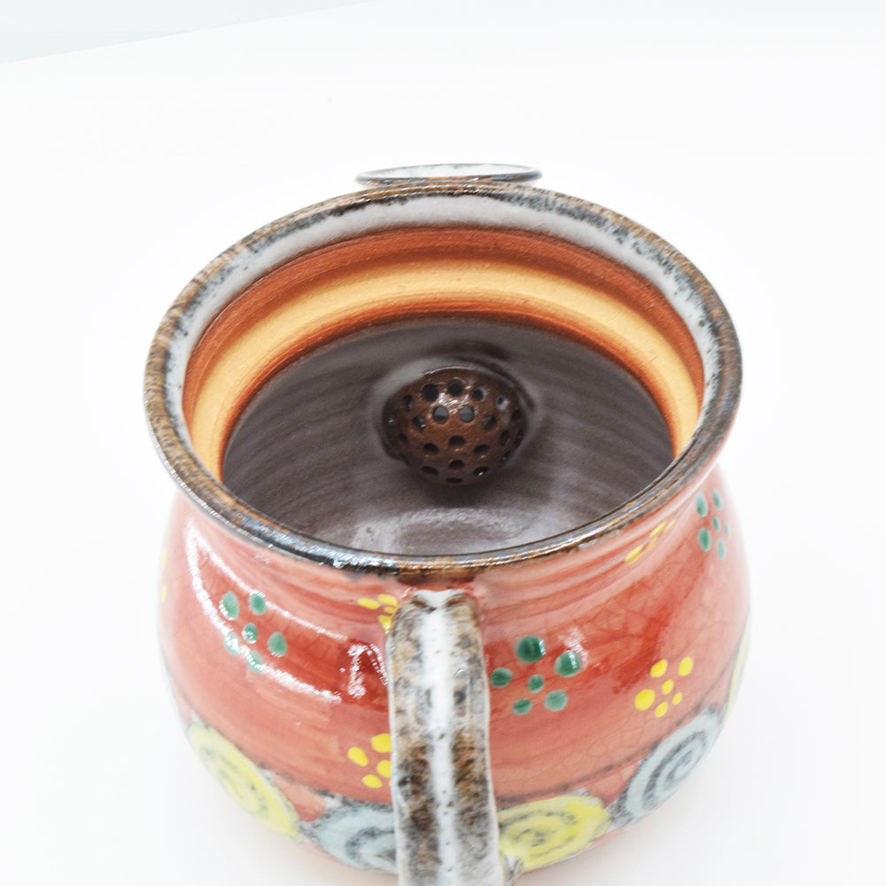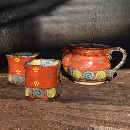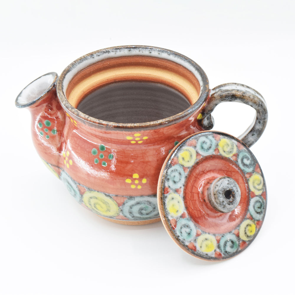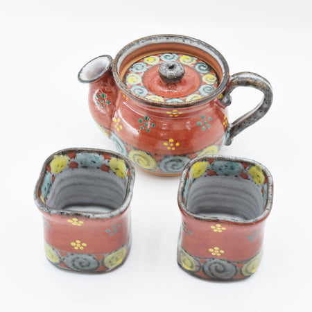 [Product name] Red-painted Umebachi-mon small tea set [Product description] Red-painted Umebachi-mon series with a colorful yet calming color scheme that catches the eye. This is a 3-piece set consisting of a teapot and 2 cups. An adult tea time item that is perfect for relaxing and enjoying a warm cup of tea with your guests.(Set contents) ・Teapot ・Drain x2 [Size] (Teapot) ・Height: 3.1" ・Width with handle: 5.8" ・Width without handle: 4.5" (Drain)・Height: 2.4" ・Diameter: 2.5" (weight) ・Teapot: 283g ・Dumping (1 piece): 121g ・Set: 532g Pottery stone, kaolin, etc.) Firing temperature: 1249°C, 14 hours Top paint: Conforms to the Japanese Food Sanitation Law (attached certificate) Top paint firing temperature: 800°C, 8 hours firing There are changes in - Size(MM)
