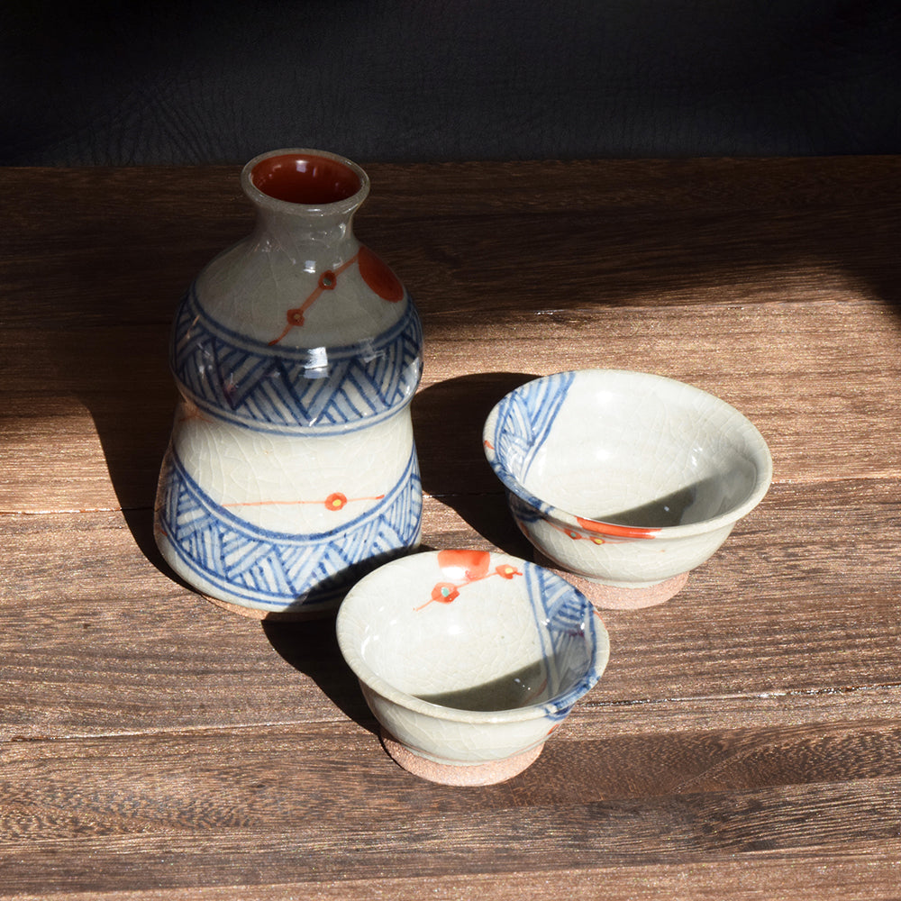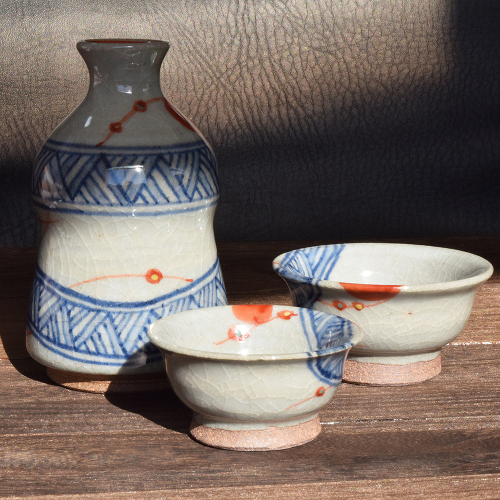 Pottery Hiryu Kuroda Kagasaburo Kiln sake set Sometsuke red painting