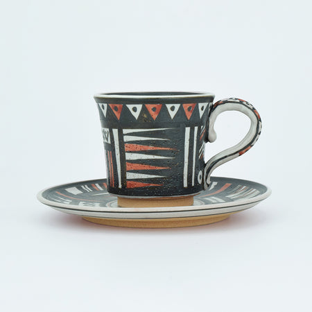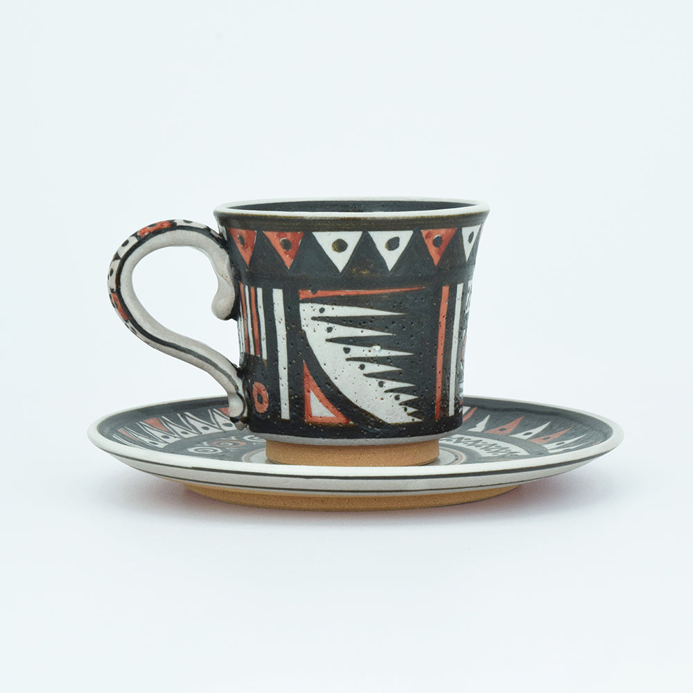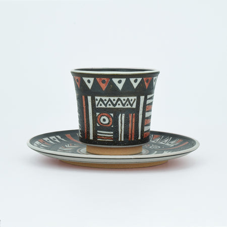 [Product name] Arabesque coffee set [Product description] A highly designed arabesque series with an arabesque pattern that is rare in Shimizu pottery. It has a unique design, but the subdued colors create a chic and modern atmosphere. This is a coffee set with a calm design designed with a black base unlike other arabesque series. It is a dish that will be appreciated if you serve it to customers in a stylish and calm atmosphere. Couples can use it together with the round and cute coffee set from the same series.(Set contents) ・Dish x1 ・Cup x1 [Size] (Dish) ・Height: 0.8" ・Width: 6.3" (Cup) ・Height: 3.1" ・Diameter: 3.3" ・Width including handle: 4.7" (weight) ・Dish: 179g ・Cup (1): 179g ・Set: 358g Pottery stone, kaolin, etc.) Firing temperature: 1249°C, 14 hours firing Top paint: Conforms to the Japanese Food Sanitation Act (attached certificate) Top paint firing temperature: 800°C, firing for 8 hours There are changes. - Size(MM)