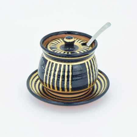 [Product name] Gold Ruri glaze Sugar pot [Product description] Gold gorgeous pattern and light, a mysterious color that looks like deep navy blue or vivid deep blue. It is an addictive and fascinating series that makes you want to collect other Potteries and arrange them on the table if you pick one up. A sugar pot that holds sugar can be used as a companion for yourself every day or when serving drinks to customers. If you line it up with the coffee set from the same series, it will create a gorgeous and luxurious atmosphere on the table. . . . Produces a beautiful golden glow. . . The gold color in this series is a gold liquid made by dissolving pure gold fine powder in camphor oil. By firing at 779°C, the camphor oil is burned off, and the gold film is fixed to create a beautiful gold shine.[Size] ・Height: ・Width: 3.3" (weight) 240g [Raw materials] Original soil: Made in Japan, Clay glaze: Made in Japan, Raw materials for soil and stone (feldspar, limestone, pottery stone, kaolin, etc.) Firing temperature: 1249 ° C, 14 hours firing Top paint: Compliant with the Domestic Food Sanitation Law (attached Certificate) Upper paint firing temperature: 800°C, 8 hours firing - Size(MM)