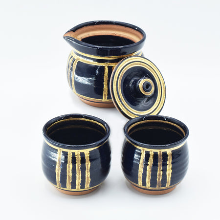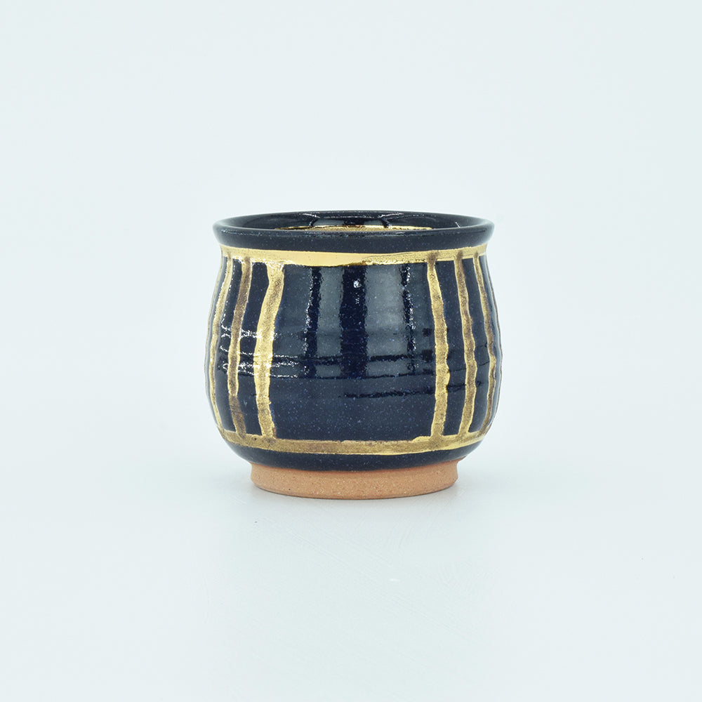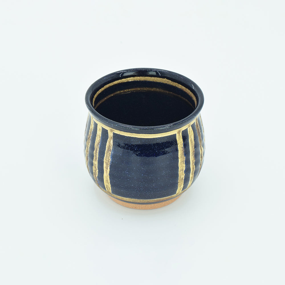 [Product name] Gold Ruri glaze Assortment of small tea utensils [Product description] Gorgeous gold pattern and mysterious color gold Ruri glaze that can be seen in deep navy blue or vivid deep blue depending on the amount of light. It is an addictive and fascinating series that makes you want to collect other Potteries and arrange them on the table if you pick one up. This is a 3-piece set consisting of a teapot and 2 cups. A teapot without a handle has a high design and looks elegant when pouring. Please enjoy a relaxing time where two people can enjoy one drink together with a tasteful small tea set. . . . Produces a beautiful golden glow. . . The gold color in this series is a gold liquid made by dissolving pure gold fine powder in camphor oil. By firing at 779°C, the camphor oil is burned off, and the gold film is fixed to create a beautiful gold shine.(Set contents) ・Teapot ・Drain x2 [Size] (Teapot) ・Height: 2.9" ・Width: 3.7" (Drain) ・Height: 2.4" ・Diameter: 2.6" (Weight) ・Teapot: 225g, Pumped out: 96g, Set: 432g [Raw materials] Original soil: Made in Japan, Clay glaze: Made in Japan, Raw materials for soil and stone (feldspar, limestone, pottery stone, kaolin, etc.) Firing temperature: 1249°C, 14 hours firing Top paint: Conforms to Japan's Food Sanitation Law (certificate attached) Top paint firing temperature: 800°C, 8 hours firing - Size(MM)