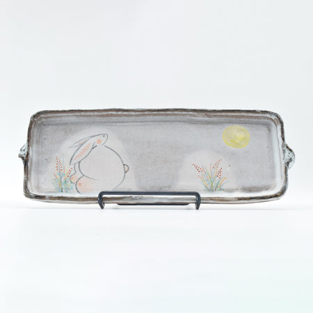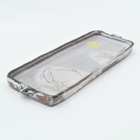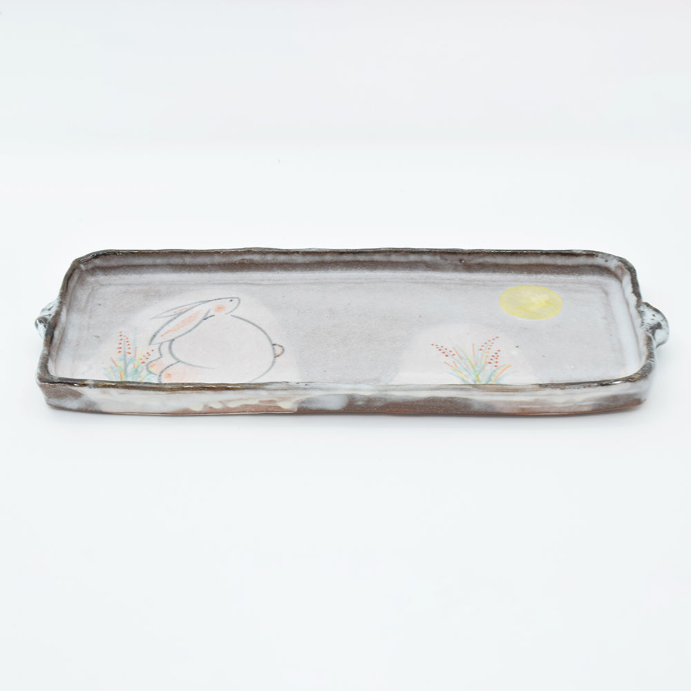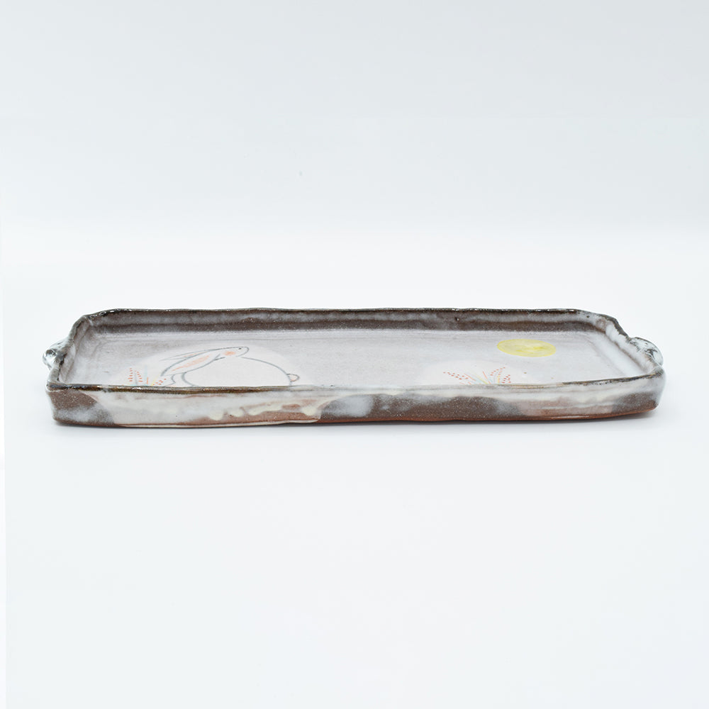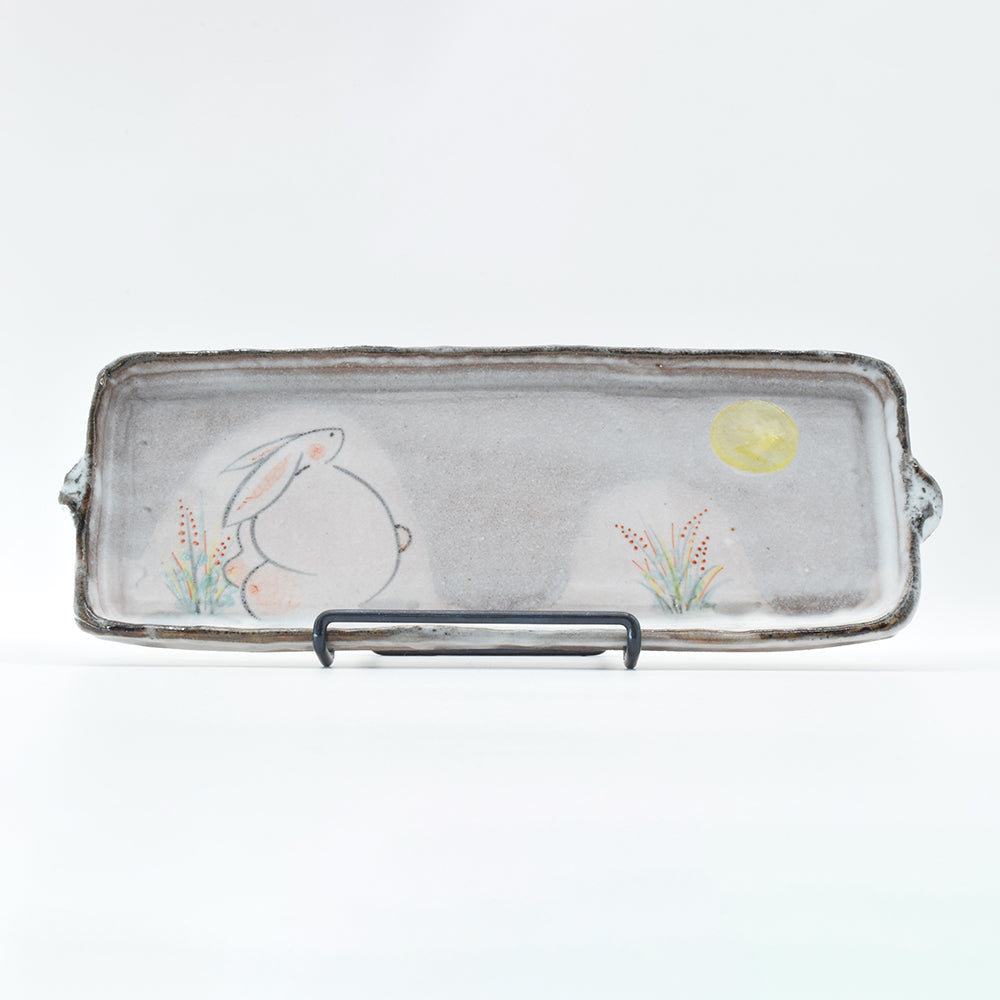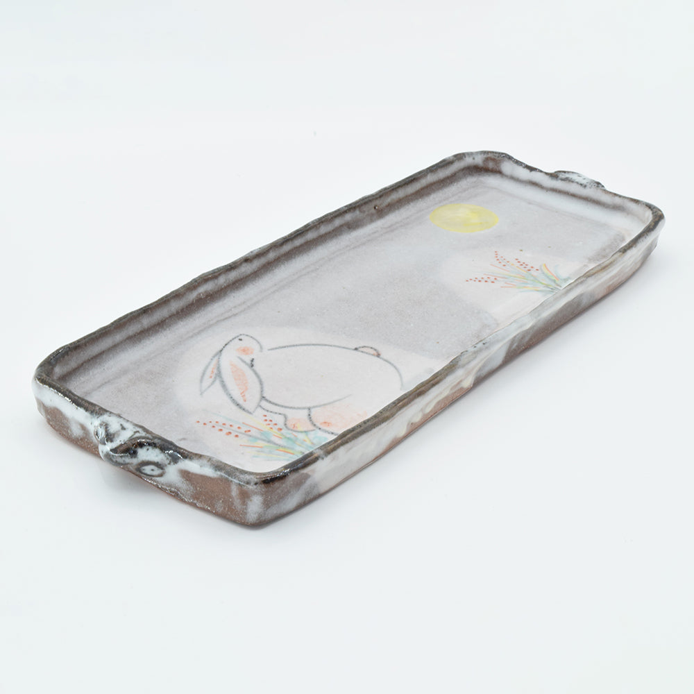 [Product name] Overglaze picture autumn grass rabbit crest Large plate with double-ear border [Product description] A cute long plate with a rabbit looking at the moon. It's going to be fun to serve food. We also sell a small size that is different in size, so please take a look at that as well.[Size] ・Height: 0.7" ・Width: 10.6" ・Depth: 3.8" (weight) 386g [Raw materials] Original soil: Made in Japan, Clay glaze: Made in Japan, Soil and stone materials (feldspar, limestone, pottery stone, kaolin, etc.) Firing temperature: 1249°C, 14 hours firing Top paint: Conforms to the Japanese Food Sanitation Act (attached certificate) Top paint firing temperature: 800°C, 8 hours firing* Due to the natural ingredients, slight variations may occur. - Size(MM)