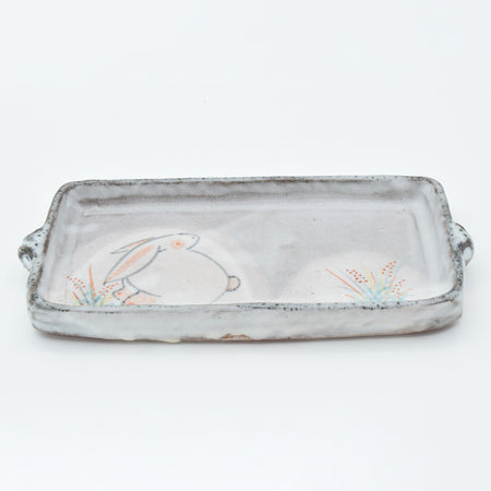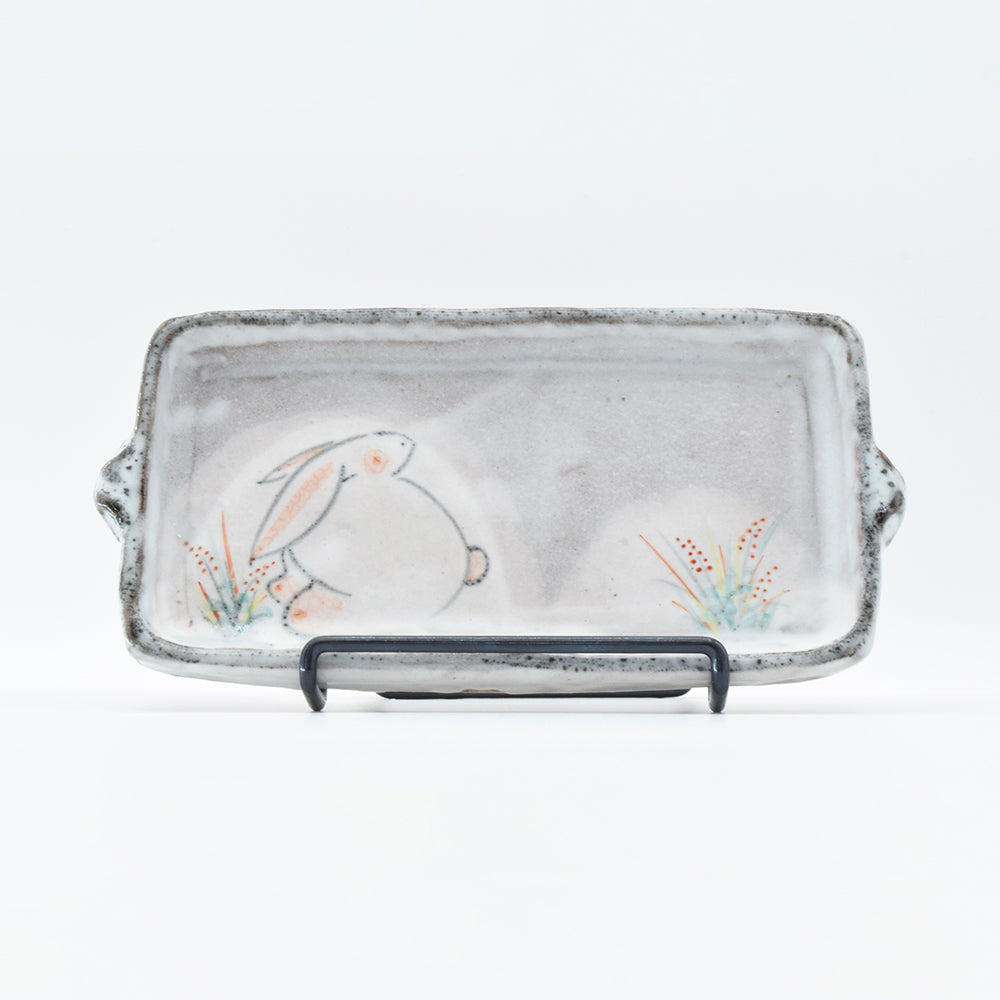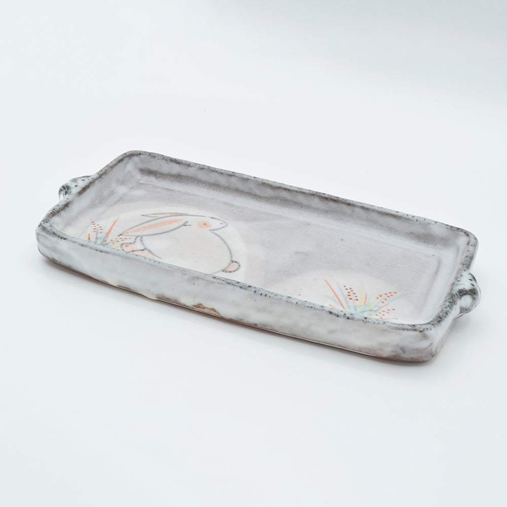[Product name] Overglaze picture Akikusa rabbit crest, long plate with two-ear border, small [Product description] A cute long plate with a rabbit looking at the moon. It's going to be fun to serve food. We also sell large sizes that are different in size, so please take a look at that as well.[Size] ・Height: 0.7" ・Width: 6.9" ・Depth: 3.6" (weight) 276g [Raw materials] Original soil: Made in Japan, Clay glaze: Made in Japan, Soil and stone materials (feldspar, limestone, pottery stone, kaolin, etc.) Firing temperature: 1249°C, 14 hours firing Top paint: Conforms to the Japanese Food Sanitation Act (attached certificate) Top paint firing temperature: 800°C, 8 hours firing* Due to the natural ingredients, slight variations may occur. - Size(MM)