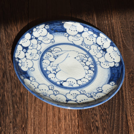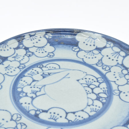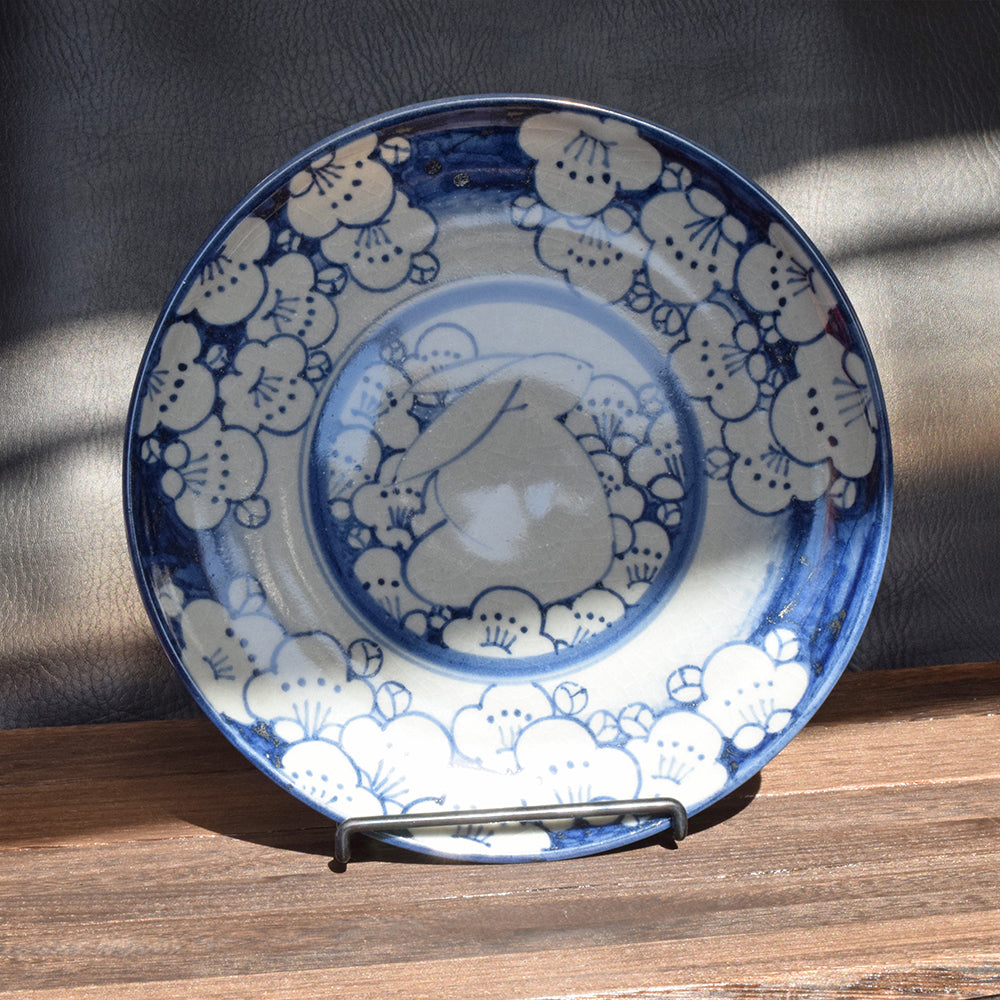 Pottery Hiryu Kuroda Kagasaburo Kiln saucer Sometsuke flower plum rabbit crest
