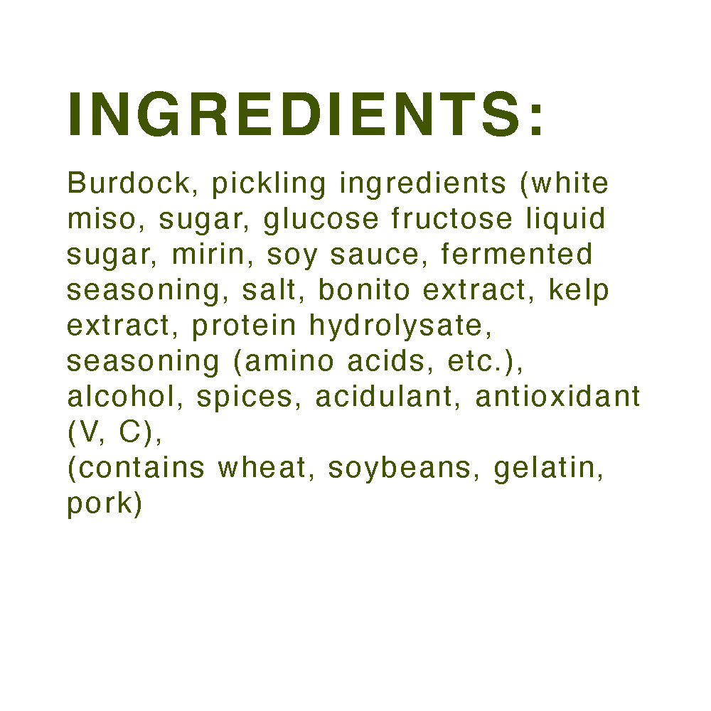 - Sweet & Savory Burdock with White Miso - A refined balance of burdock root’s texture with the mild sweetness of white miso and soy sauce. Pairs well with rice or sake.