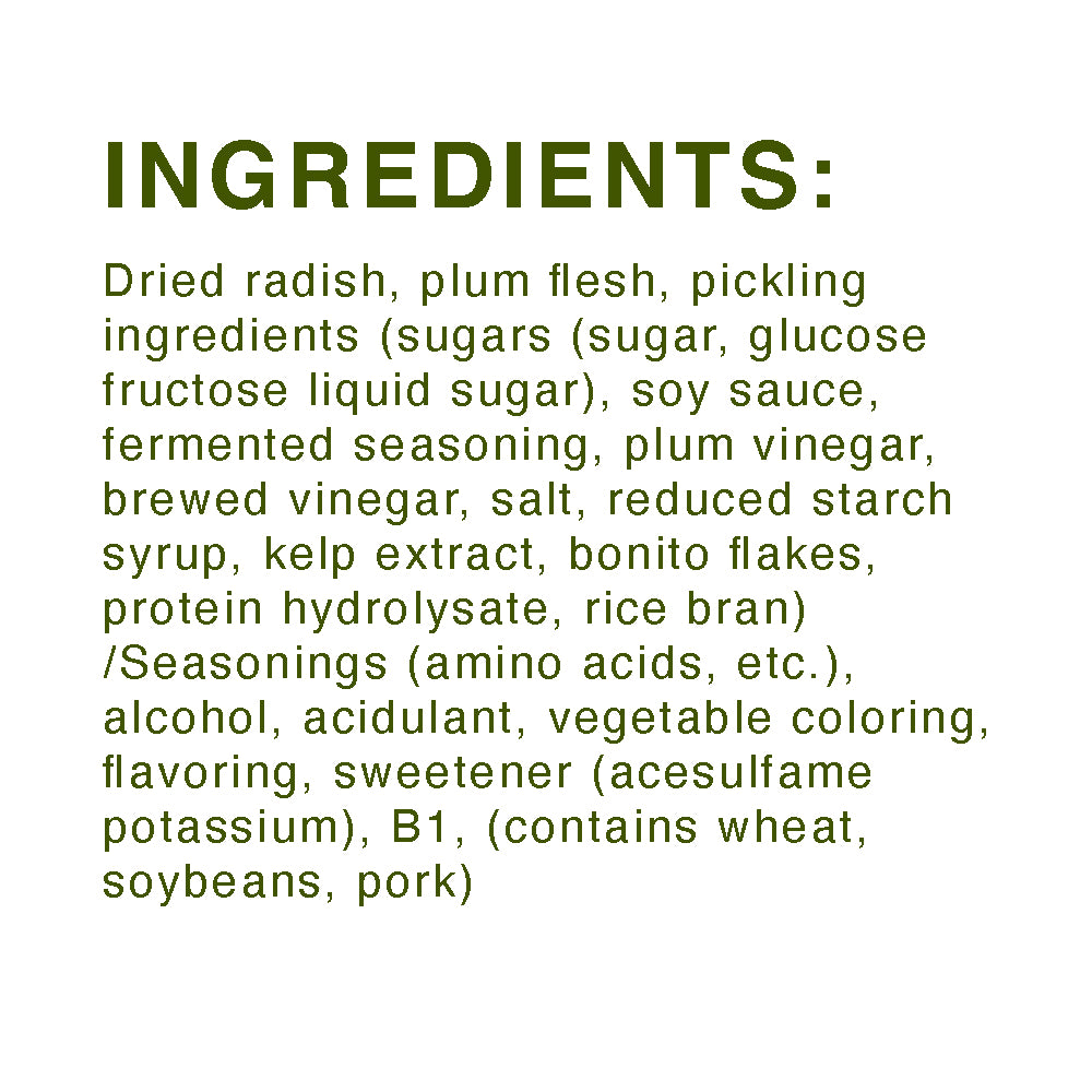 - Plum. Infused Sun. Dried Pickles (Takuan) - Traditional sun. dried takuan radish, combined with plum paste and bonito for a mildly tangy, umami. rich taste.