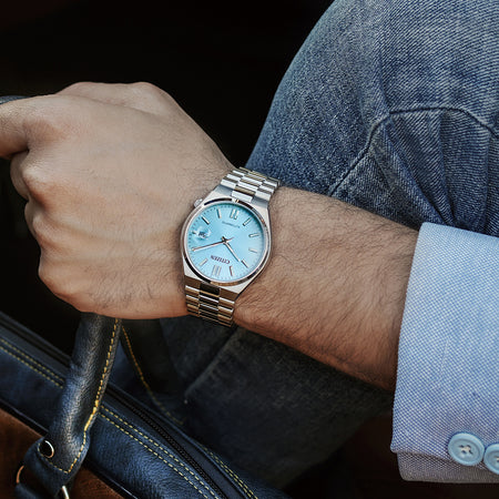 Dial Color: Ice blueBelt Color: SilverDisplay Type: Analog display