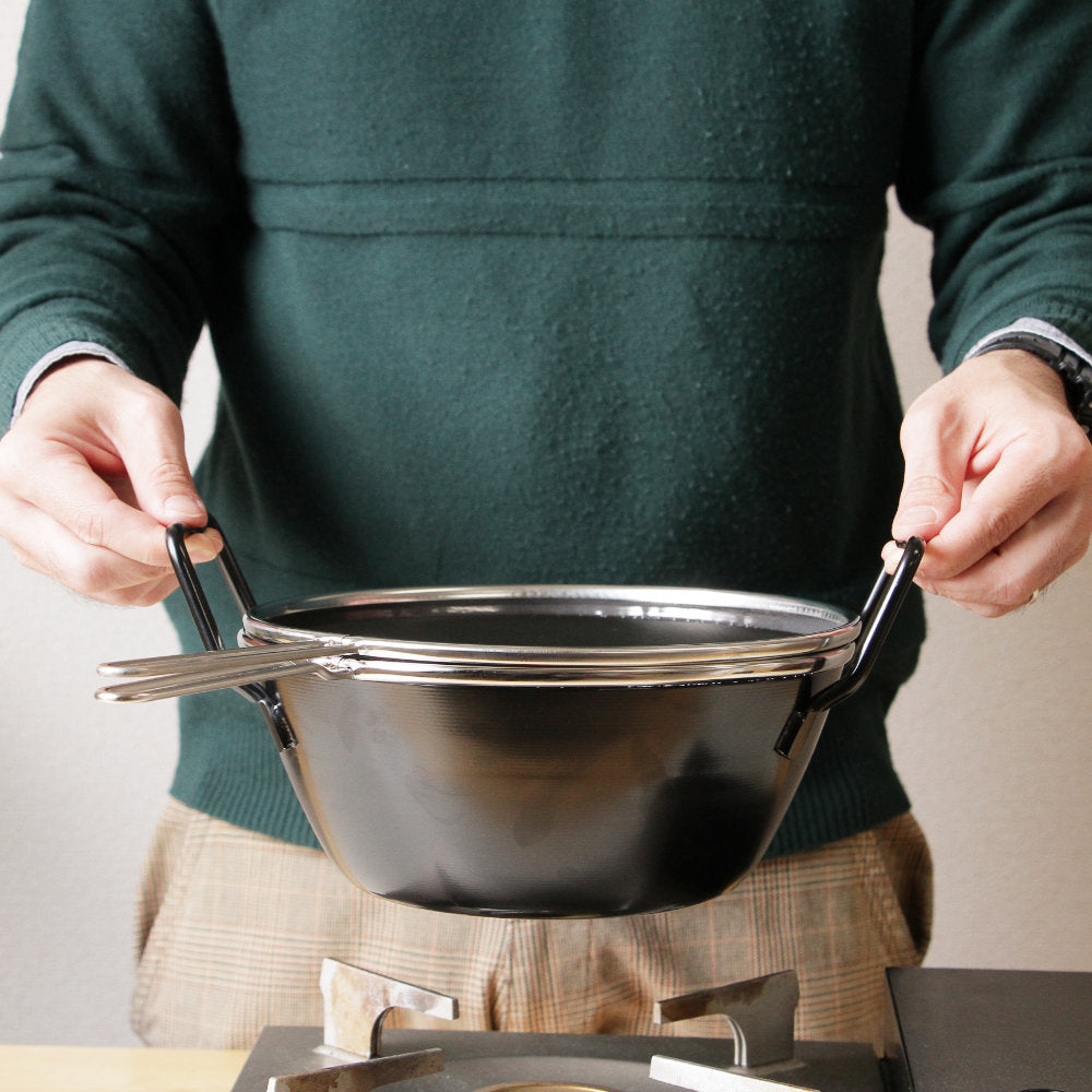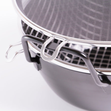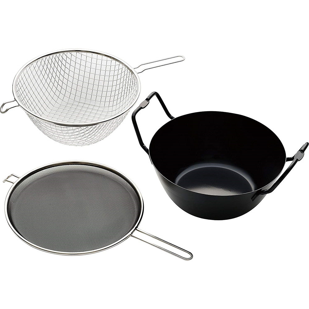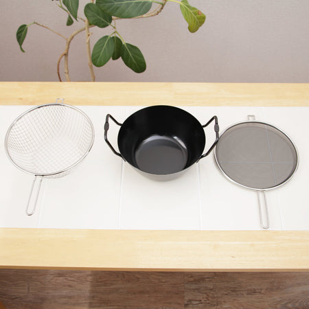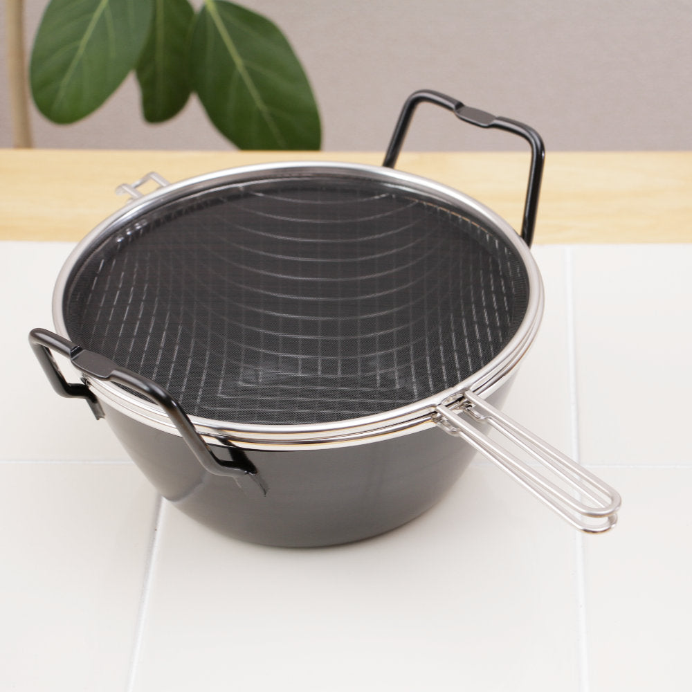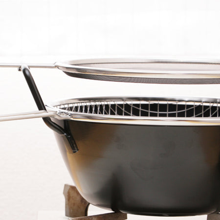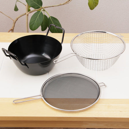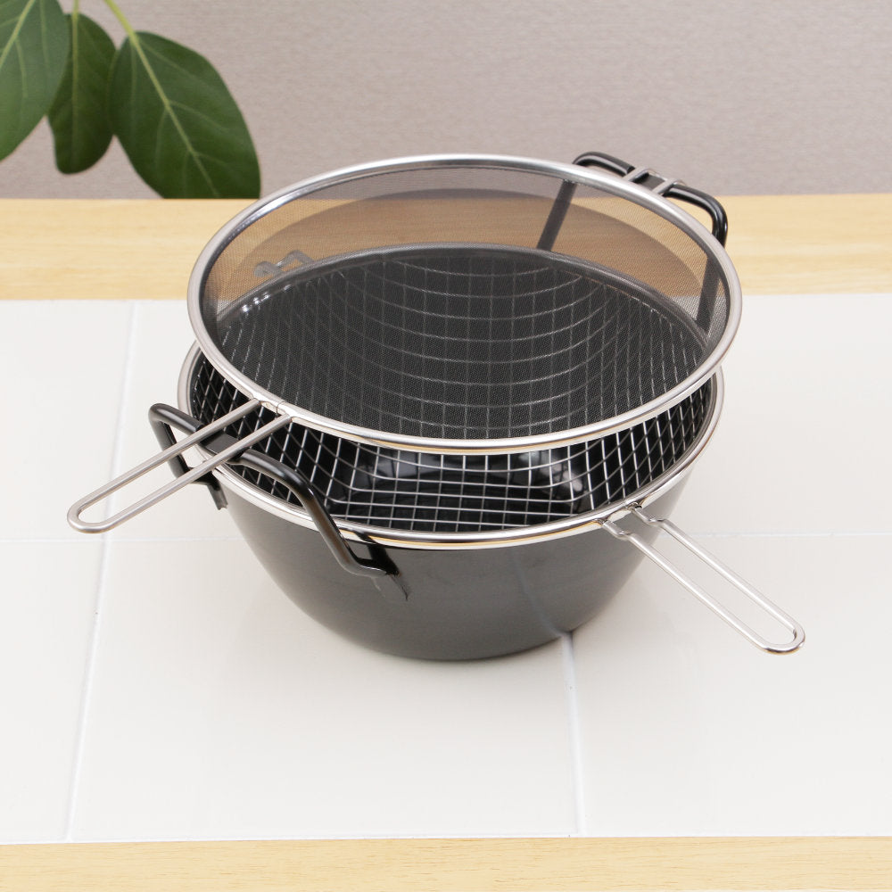 Yoko Arimoto's kitchen brand "la base", a culinary researcher and recommended by housewives around the world, is a frying pan set that eliminates the stress of frying food. An excellent product that even beginners can make delicious and well-fried dishes. It is an excellent deep-fryer that can be fried easily and deliciously, and the surroundings are stain-free. After all, it is an iron pot that makes tempura delicious. The iron body makes the fried food crispy and juicy inside as expected. The frying basket is welded at all intersections to prevent stains from accumulating and keep it clean. The Straw Bag allows you to pull it all at once, so you won't miss the deliciousness of the time lag. If you put it on the handle of the pan, you can drain the oil, and you can easily fry it twice as it is. The best feature of the oil splash prevention net is that the mesh part is black. When you hold it up, you can see the inside clearly, so you can check the condition of the fried food while suppressing oil splash. The mesh is black due to oxidation, so there is no need to worry about fading. The iron body has high heat storage and is ideal for a crisp finish. Thanks to the anti-splash net, the outside and kitchen are less likely to be stained, and maintenance and cleaning are easy.