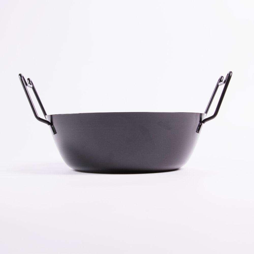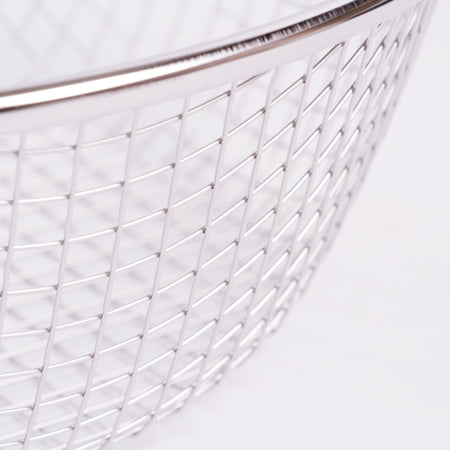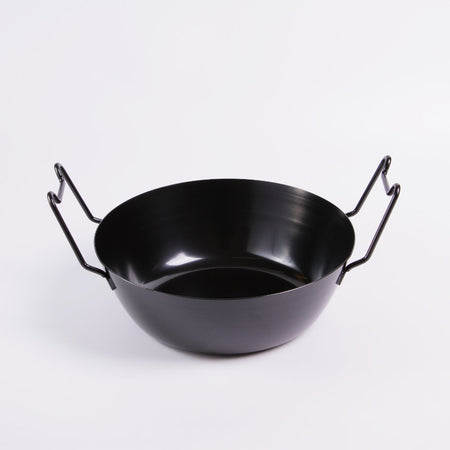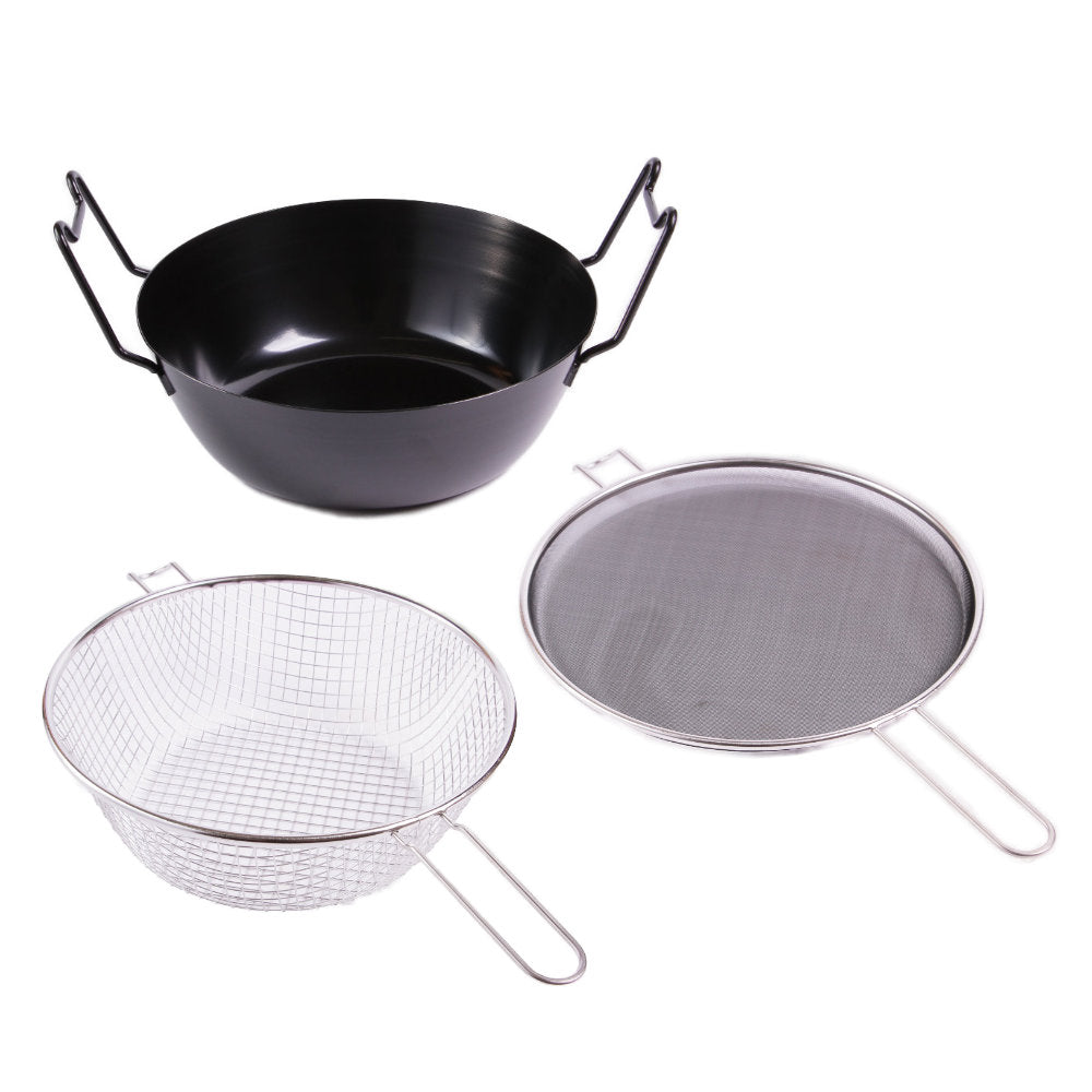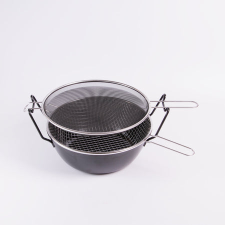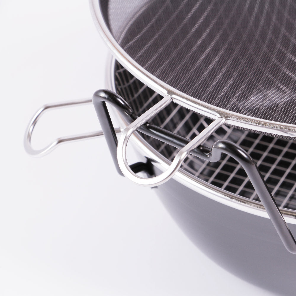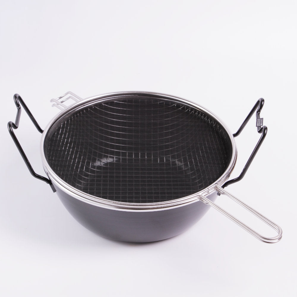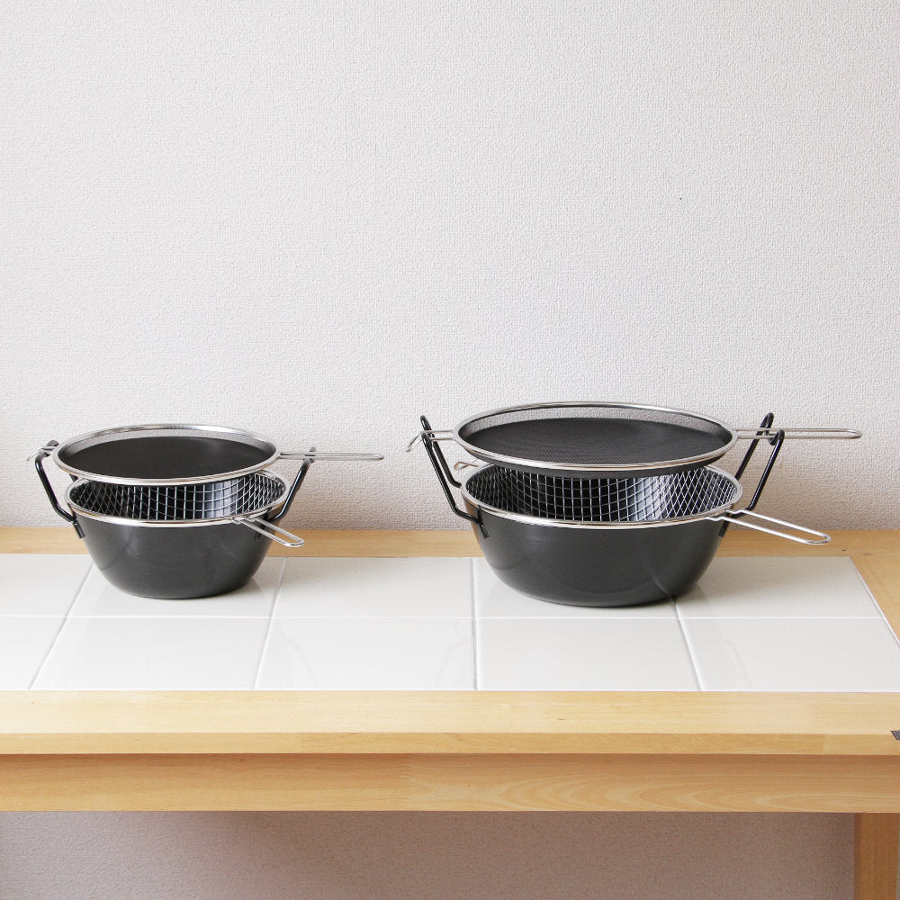 Material: Body: Iron blue temper material (silicon coating), Handle: Iron (baking finish), Frying basket and oil splash prevention net: 18-8 stainless steel
