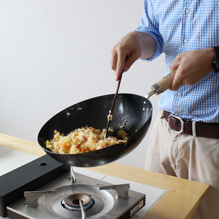 Material: Body: Iron (cold-rolled polished steel plate), Handle: Natural wood, Surface finish of body: Special heat treatment (nitrogen impregnation)