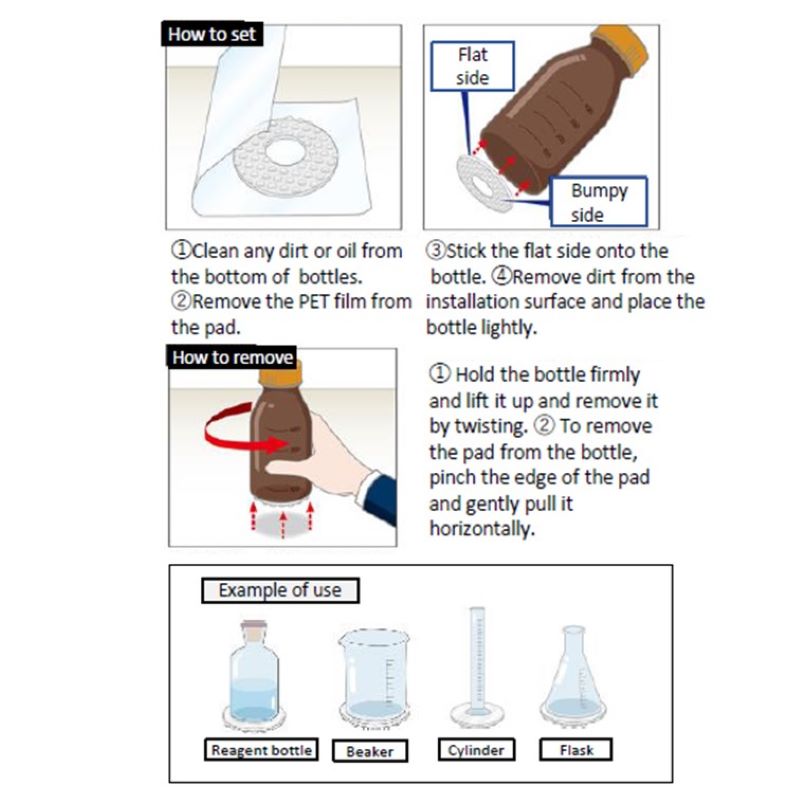 - Clean any dirt or oil from the bottom of bottle. Remove the PET film from the pad. Stick the flat side onto the bottle. Remove dirt from the installation surface and place the bottle lightly. To remove the bottle from the installation place: Hold the bottle firmly and remove by twisting and lifting. To remove the pad from the bottle; Pinch the edge of the pad and gently pull it horizontally.