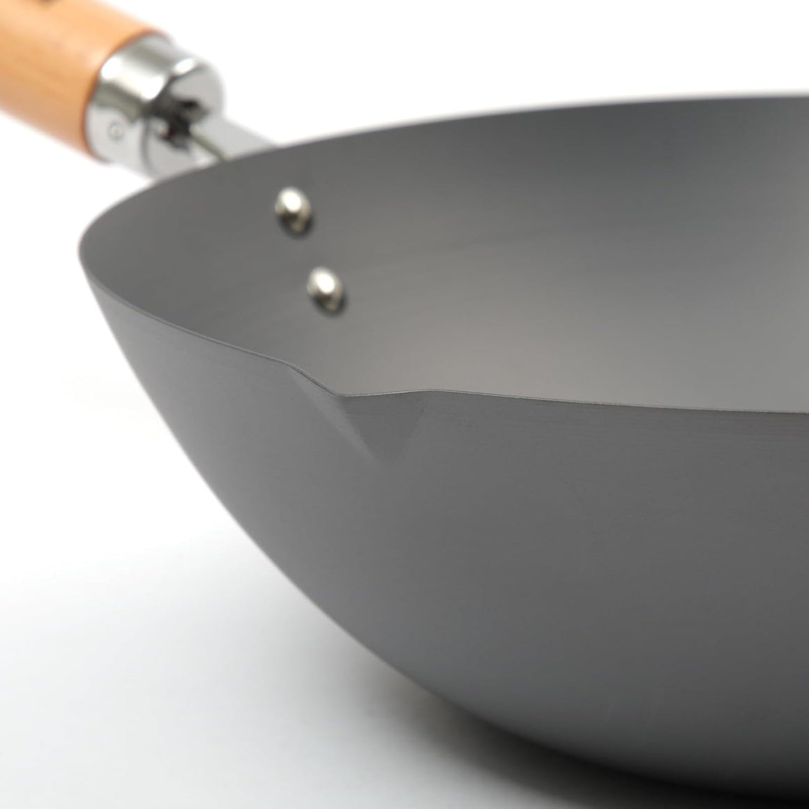 The spout on the edge of the pan is positioned on the right side, making it very convenient for transferring stir-fried dishes onto a plate.
