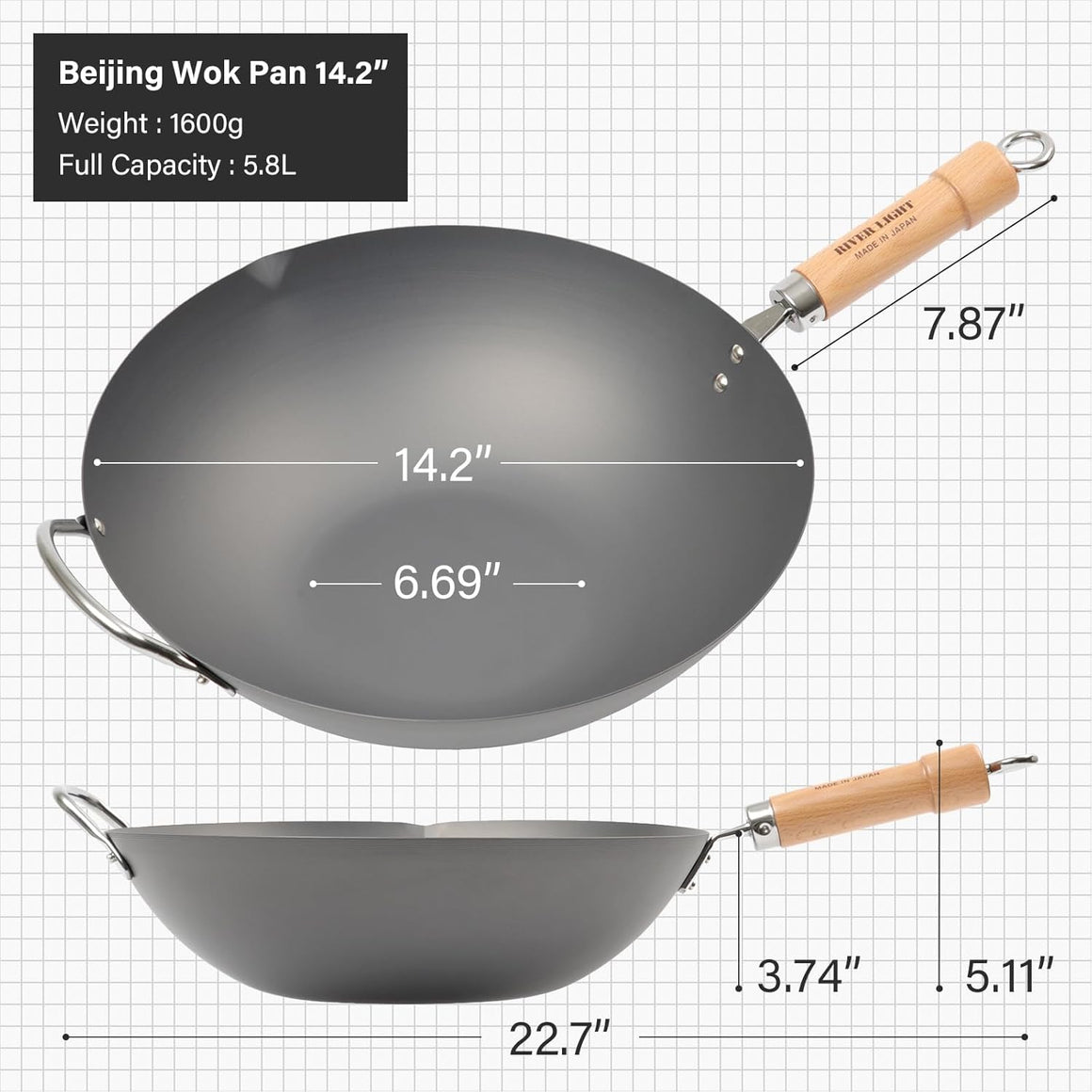 Riverlight KIWAME PREMIUM Wok pan,Wooden Handle,Peking Wok,Beijing Wok 14.2inch