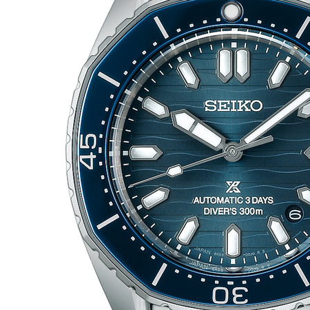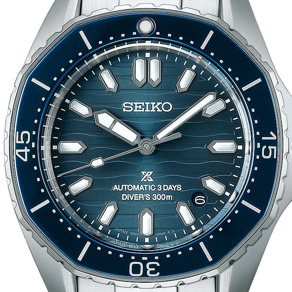 - Introducing a diver's watch that combines authentic sports watch functionality with an elegant finish, making it suitable for a variety of occasions from business to resorts. It features the performance of an authentic sports watch, and an elegant design that blends in with business as well as resort scenes such as waterside activities and dinners. The case and bracelet with a wide mirror surface fit well on the wrist and give off an elegant shine. The polygonal bezel, composed of gently curved surfaces, boasts excellent versatility that suits a variety of scenes from business to resorts while still giving off an active impression. The clean and refreshing dial features a dial pattern that evokes the calm and elegant scenery of the coastline. The needle shape and Lumibrite provide the visibility unique to sports watches, making it easy to check the time even in dark places. In addition to being equipped with the new caliber 6R55 (3DAYS), it is waterproof to 300m for air diving, and has the specifications of a genuine diver's watch.