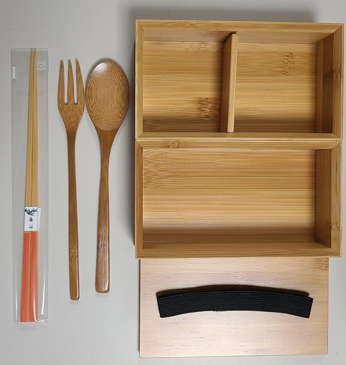Traditional Japanese Smoked Bamboo Bento Lunch Box & three bamboo cutleries
