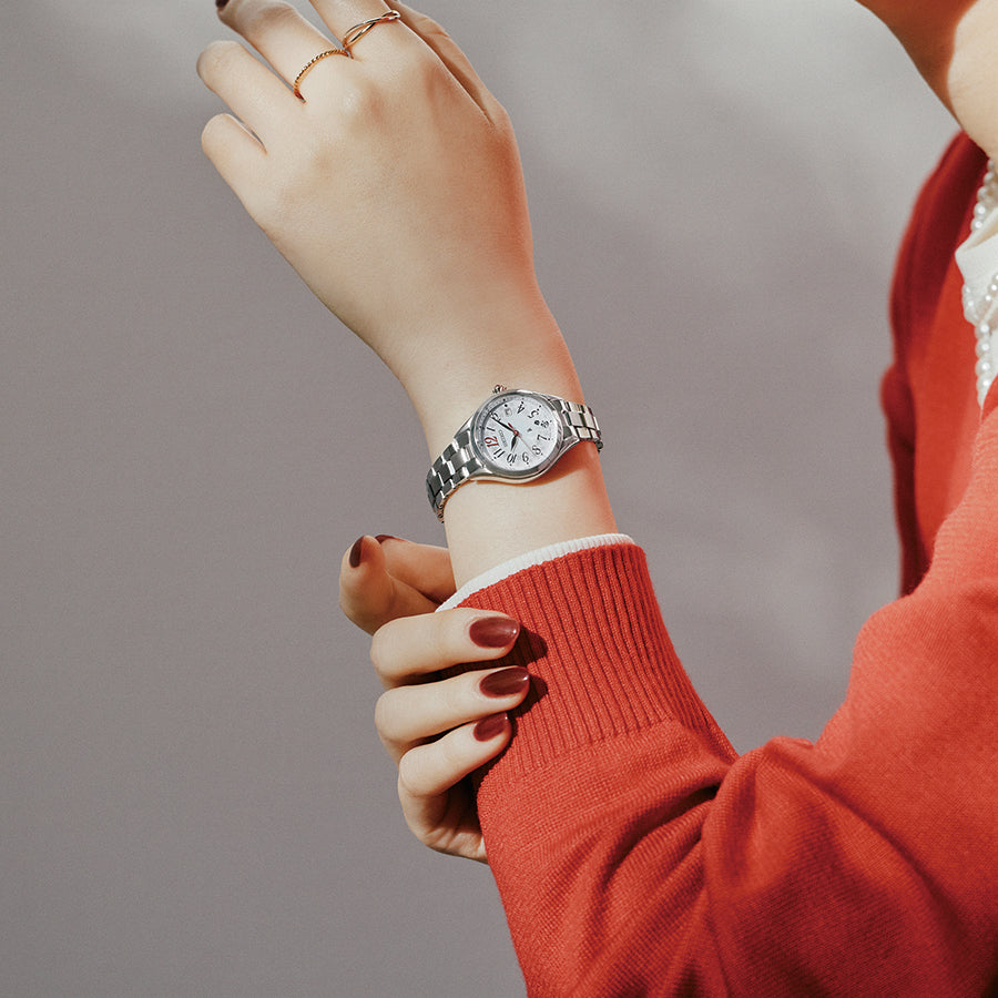 To celebrate the brand's 30th anniversary, the outer periphery of the white mother-of-pearl dial depicts the image of flowers in full bloom, overflowing with a sense of happiness.