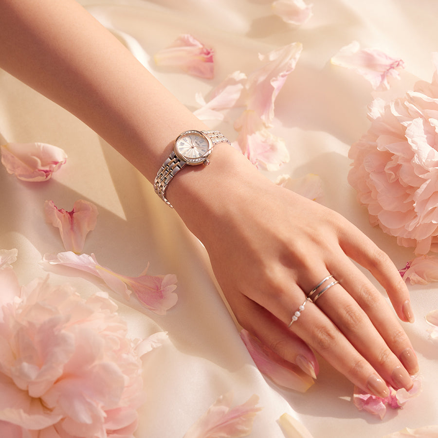 The lab-grown diamonds on the case are set in different sizes along the curve of the bezel design, which represents the appearance of a peony in bloom.