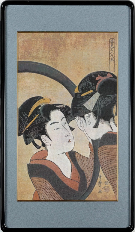 This woodblock print was created by ukiyo-e artist Kitagawa Utamaro between 1792 and 1793 and is said to be one of his greatest masterpieces. It depicts a woman with a seductive expression fixing her hair in front of a large mirror. Kitagawa Utamaro was known as a master of portraits of beautiful women, and established his own unique style in his work. He portrayed a wide variety of women, from commoners to courtesans, with elegance, grace and delicacy.
