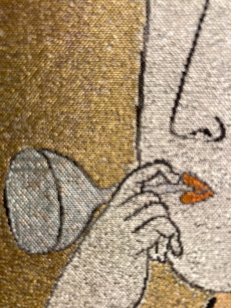 This work depicts a town girl wearing an impressive red checkered kimono. If you look closely at the pattern of the kimono, you can see scattered cherry blossoms. She is blowing a Vidro, a glass toy that makes a sound when blown into. The method of making Vidro was introduced by the Dutch who came to Nagasaki Prefecture during the Muromachi period. The title of the work, "Poppin," represents the sound made when blowing into a Vidro.