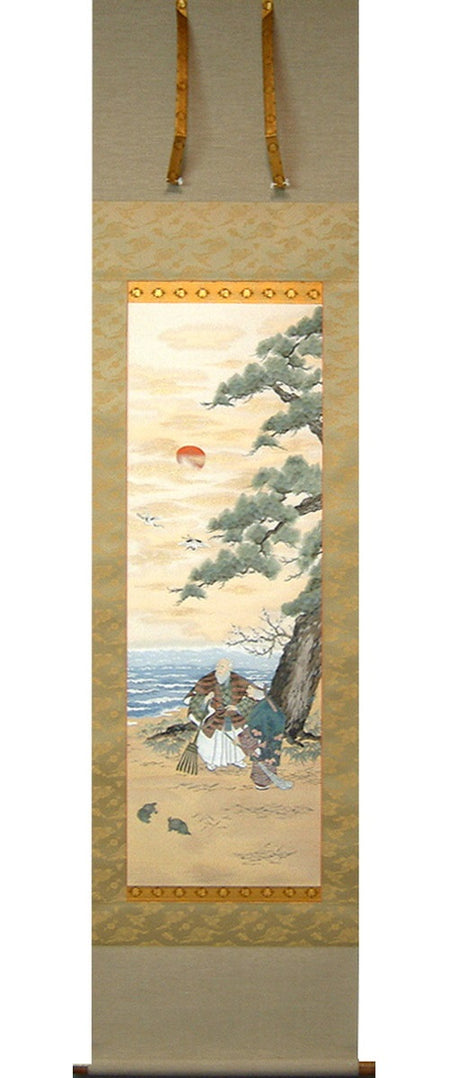 The painting depicts a smiling elderly couple, who are the spirits of the millennium pine tree. These spirits have been said to be symbols of a "happy marriage" and "longevity and health."