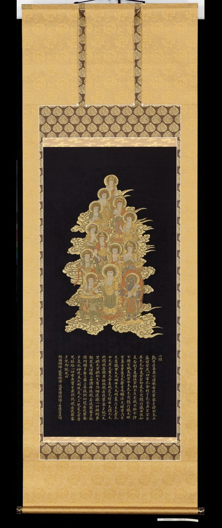 This hanging scroll features 13 Buddhas and Bodhisattvas and the characters of the Heart Sutra. The Heart Sutra was written by Kukai (Hokkai).
