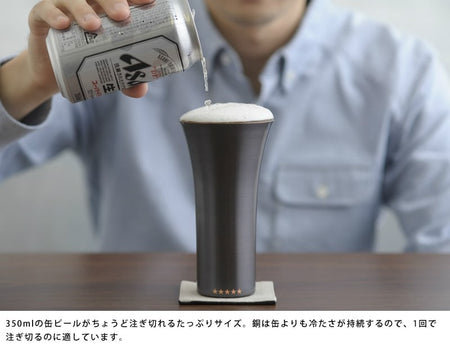 A beer tumbler made of pure copper that makes beer look as if it has been poured by a master brewer.