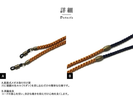 - A. Detachable eyeglass attachment: Simply insert the tip of your eyeglasses into the hole. B. Brass Hardware: Supports the center of gravity of the cord, suppressing unnecessary movement and improving comfort.