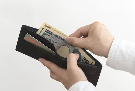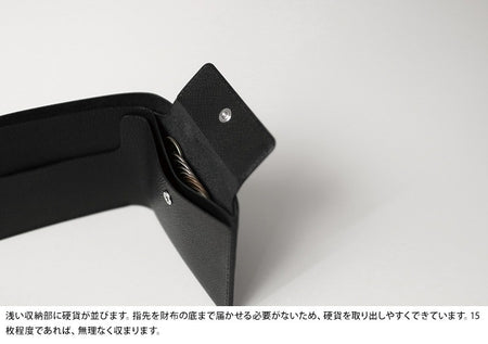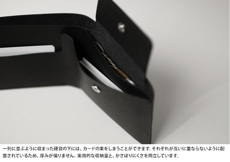 The lid of the coin compartment fits snugly into the opening of the card compartment. Coins are lined up in a shallow compartment. Coins are easy to remove because you don't have to reach the bottom of the wallet with your fingertips. It can easily hold about 15 coins. A stack of cards can be stored under the coins, which are lined up in a row. They are arranged so that they do not overlap each other, so the thickness is even. It has both a practical amount of storage and is not bulky.