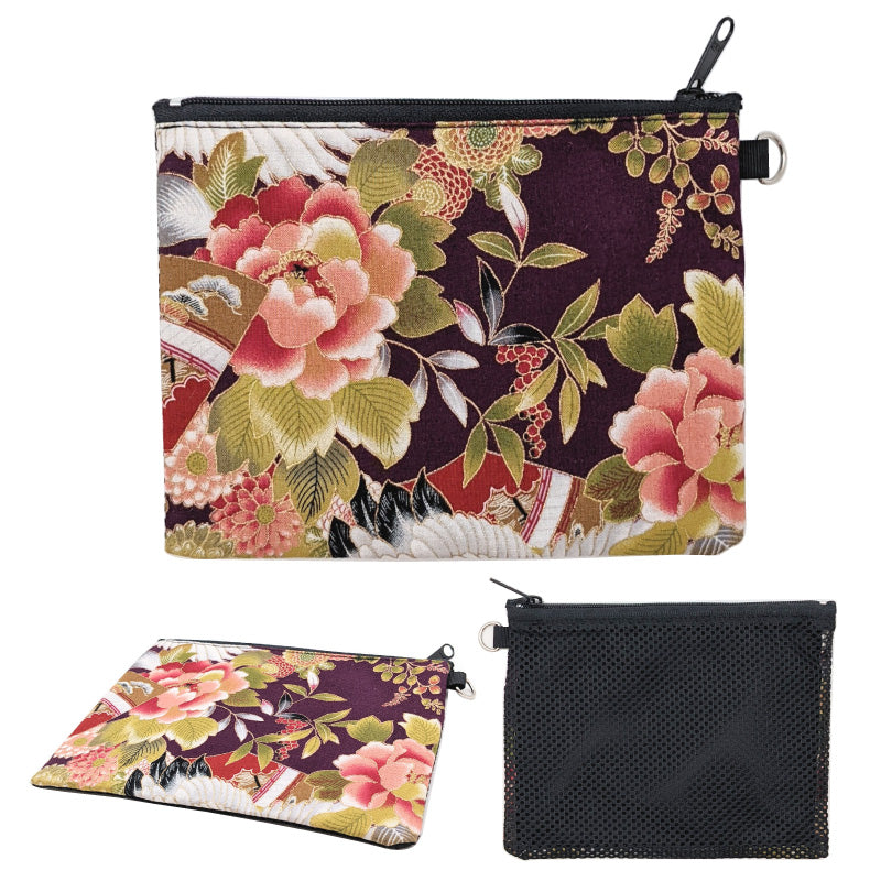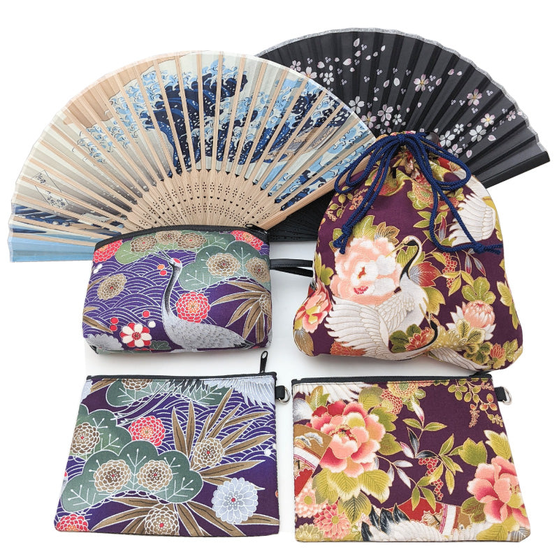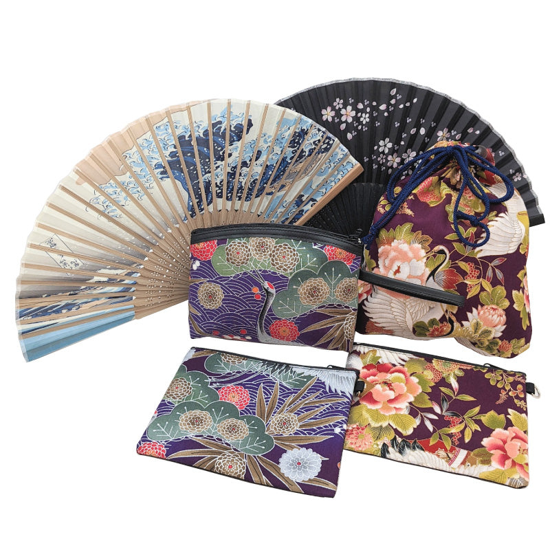 Size Note:1. Hanakomon pouch with handle 15.5x4x11㎝ 2. Hanakomon mesh pouch 15x12 cm 3. Hanakomon Drawstring Pouch 20x24㎝ 4. Silk folding fan Thirty-six views of Mount Fuji 21cm 5. Silk folding fan Sakura 21 cm