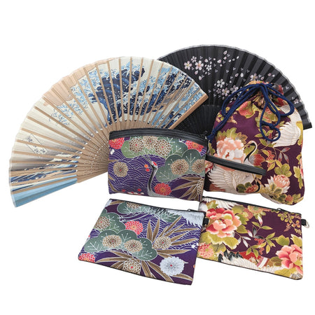 #01 JAPANESE KIMONO / 4 POUCHES / 2 FOLDING SENSU FAN / SET OF 6 / JAPAN