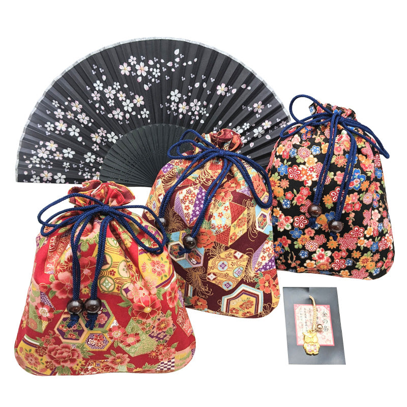Bundled Drawstring bags of Japanese traditional patterns, Fan of silk and Charm of an owl.